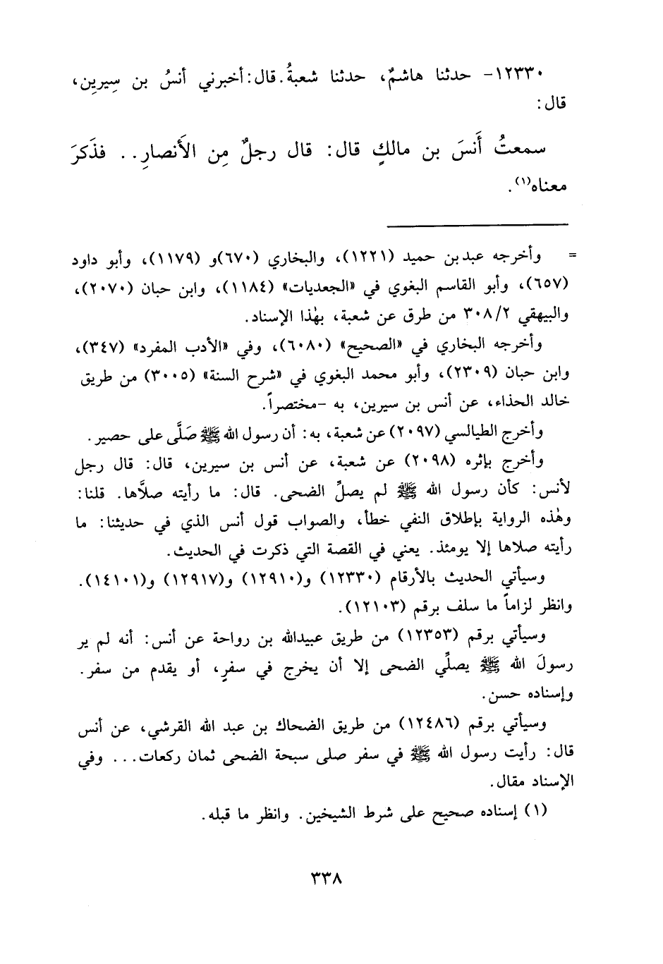 وأخرج بإثره (٢٠٩٨) عن شعبة، عن أنس بن سيرين، قال: قال رجل لأنس: كان رسول الله صَلَّى اللهُ عَلَيْهِ وَسَلَّمَ لم يصل الضحى. قال: ما رأيته صلاها. قلنا: وهذه الرواية بإطلاق النفي خطأ، والصواب قول أنس الذي في حديثنا: ما رأيته صلاها إلا يومئذ. يعني في القصة التي ذكرت في الحديث.