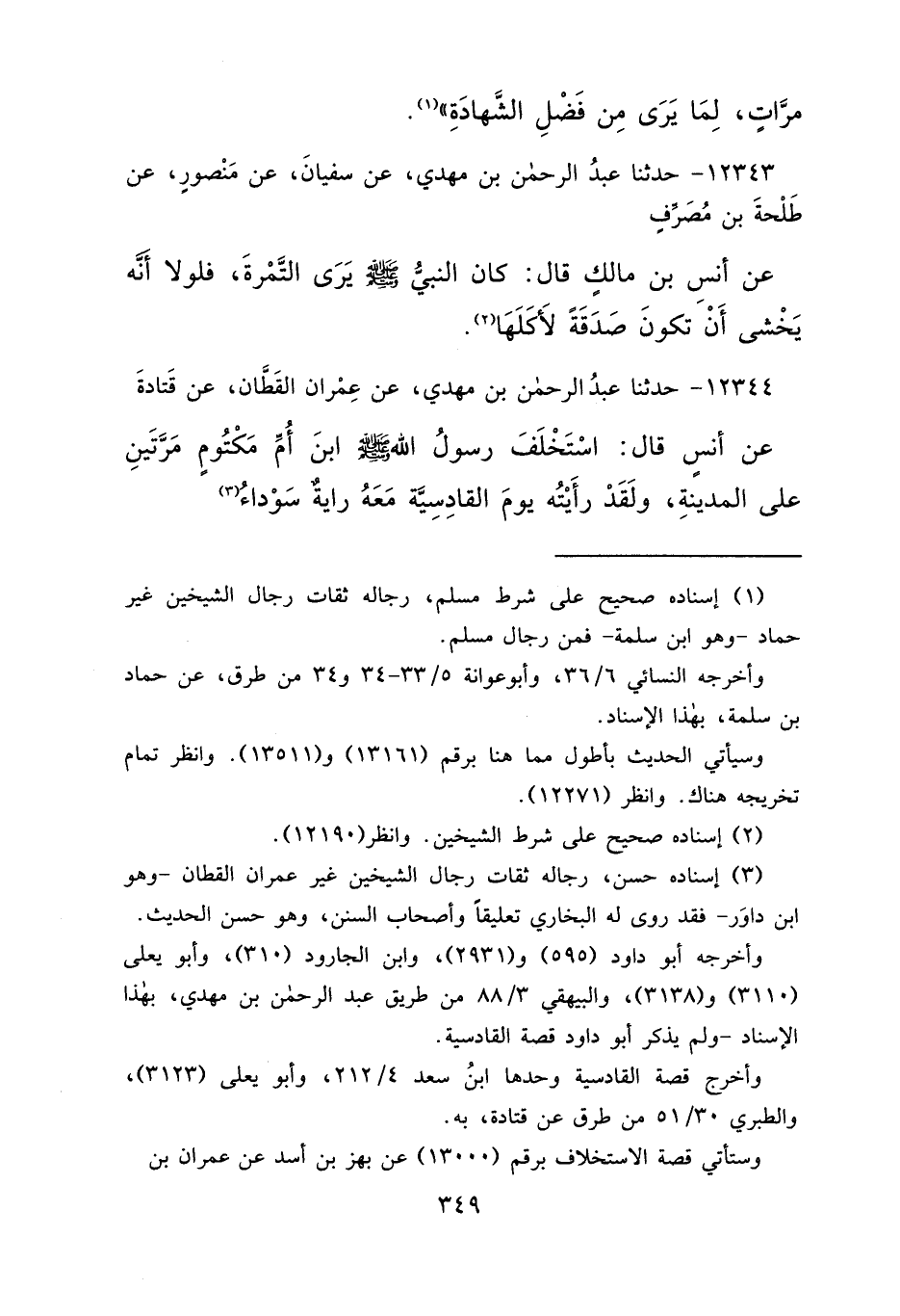 ١٢٣٤٤ - حَدَّثَنَا عَبْدُ الرَّحْمَنِ بْنُ مَهْدِيٍّ، عَنْ عِمْرَانَ الْقَطَّانِ، عَنْ قَتَادَةَ، عَنْ أَنَسٍ قَالَ: " اسْتَخْلَفَ رَسُولُ اللهِ صَلَّى اللهُ عَلَيْهِ وَسَلَّمَ ابْنَ أُمِّ مَكْتُومٍ مَرَّتَيْنِ عَلَى الْمَدِينَةِ، وَلَقَدْ رَأَيْتُهُ يَوْمَ الْقَادِسِيَّةِ مَعَهُ رَايَةٌ سَوْدَاءُ " (٣)