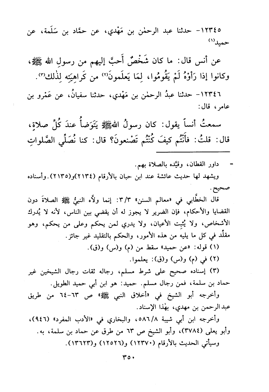 ١٢٣٤٥ - حَدَّثَنَا عَبْدُ الرَّحْمَنِ بْنُ مَهْدِيٍّ، عَنْ حَمَّادِ بْنِ سَلَمَةَ، عَنْ حُمَيْدٍ (١) ، عَنْ أَنَسٍ قَالَ: " مَا كَانَ شَخْصٌ أَحَبَّ إِلَيْهِمْ مِنْ رَسُولِ اللهِ صَلَّى اللهُ عَلَيْهِ وَسَلَّمَ، وَكَانُوا إِذَا رَأَوْهُ لَمْ يَقُومُوا لِمَا يَعْلَمُونَ (٢) مِنْ كَرَاهِيَتِهِ لِذَلِكَ " (٣)