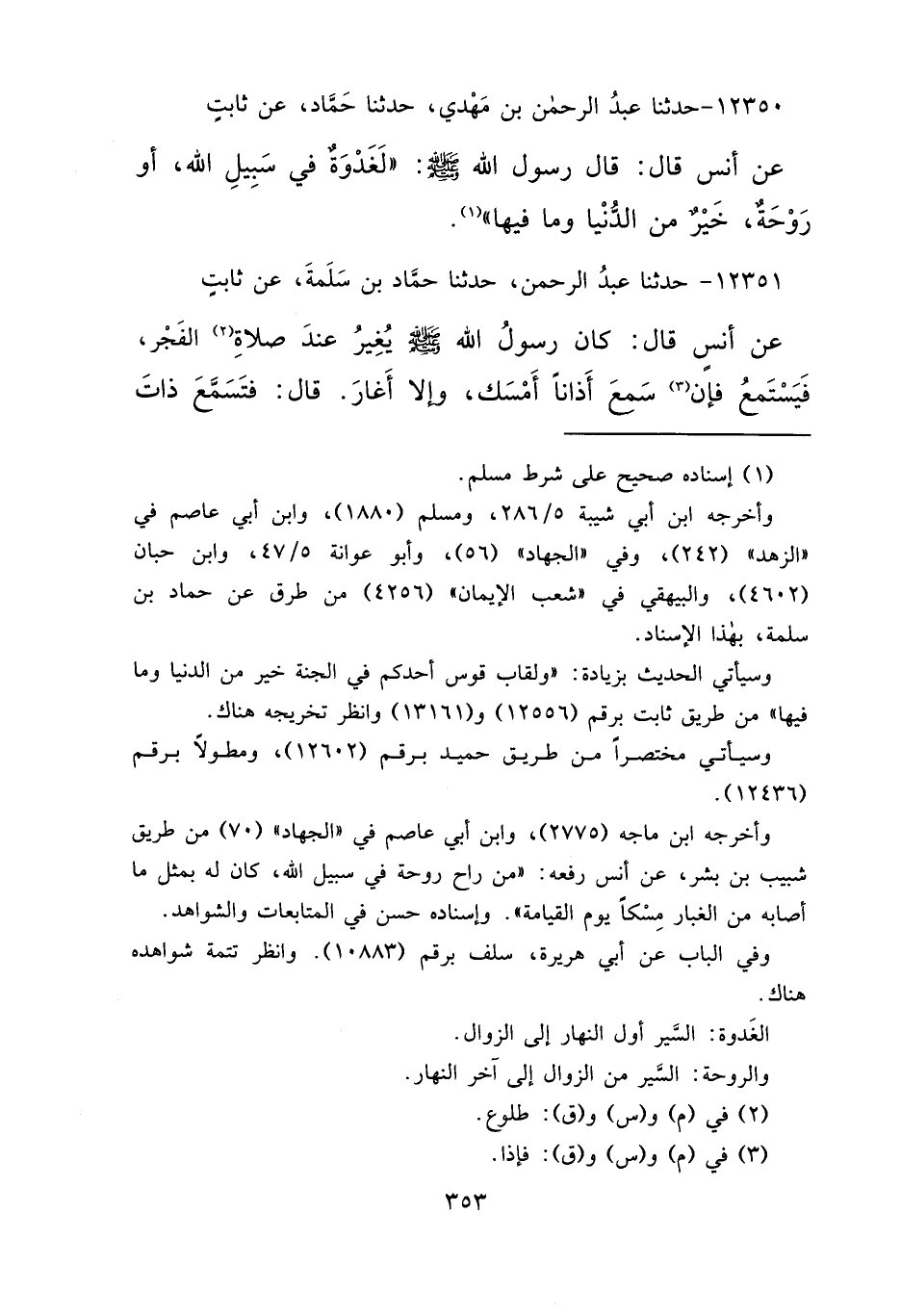 ١٢٣٥٠ - حَدَّثَنَا عَبْدُ الرَّحْمَنِ بْنُ مَهْدِيٍّ، حَدَّثَنَا حَمَّادٌ، عَنْ ثَابِتٍ، عَنْ أَنَسٍ قَالَ: قَالَ رَسُولُ اللهِ صَلَّى اللهُ عَلَيْهِ وَسَلَّمَ: " لَغَدْوَةٌ فِي سَبِيلِ اللهِ أَوْ رَوْحَةٌ، خَيْرٌ مِنَ الدُّنْيَا وَمَا فِيهَا " (١)