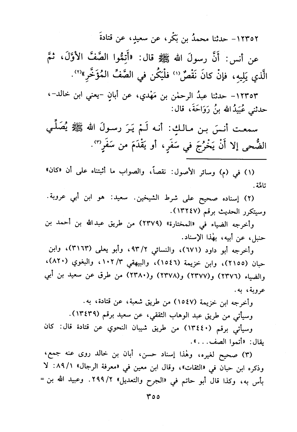١٢٣٥٣ - حَدَّثَنَا عَبْدُ الرَّحْمَنِ بْنُ مَهْدِيٍّ، عَنْ أَبَانَ يَعْنِي ابْنَ خَالِدٍ، حَدَّثَنِي عُبَيْدُ اللهِ بْنُ رَوَاحَةَ قَالَ: سَمِعْتُ أَنَسَ بْنَ مَالِكٍ، أَنَّهُ " لَمْ يَرَ رَسُولَ اللهِ صَلَّى اللهُ عَلَيْهِ وَسَلَّمَ يُصَلِّي الضُّحَى إِلَّا أَنْ يَخْرُجَ فِي سَفَرٍ، أَوْ يَقْدَمَ مِنْ سَفَرٍ " (٣)