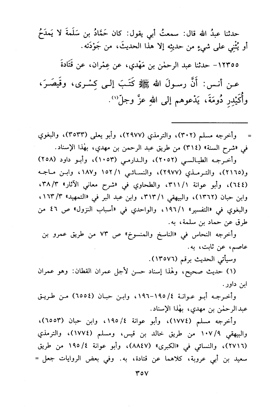 ١٢٣٥٥ - حَدَّثَنَا عَبْدُ الرَّحْمَنِ بْنُ مَهْدِيٍّ، عَنْ عِمْرَانَ، عَنْ قَتَادَةَ، عَنْ أَنَسٍ، " أَنَّ رَسُولَ اللهِ صَلَّى اللهُ عَلَيْهِ وَسَلَّمَ كَتَبَ إِلَى كِسْرَى، وَقَيْصَرَ وَأُكَيْدِرِ دُومَةَ يَدْعُوهُمْ إِلَى اللهِ عَزَّ وَجَلَّ " (١)