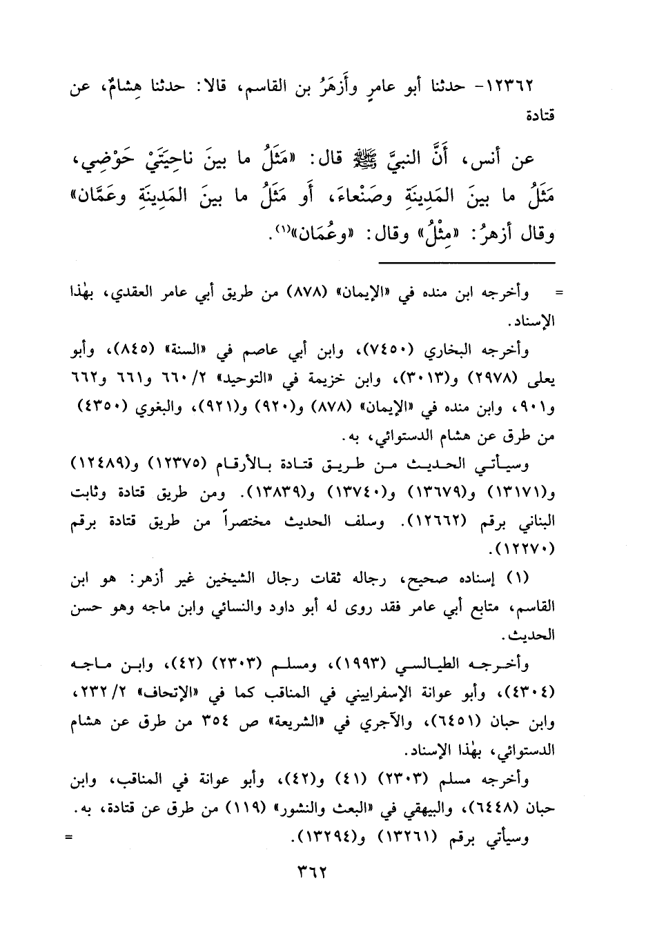 ١٢٣٦٢ - حَدَّثَنَا أَبُو عَامِرٍ، وأَزْهَرُ بْنُ الْقَاسِمِ قَالَا: حَدَّثَنَا هِشَامٌ، عَنْ قَتَادَةَ، عَنْ أَنَسٍ، أَنَّ النَّبِيَّ صَلَّى اللهُ عَلَيْهِ وَسَلَّمَ قَالَ: " مِثْلُ مَا بَيْنَ نَاحِيَتَيْ حَوْضِي، مِثْلُ مَا بَيْنَ الْمَدِينَةِ وَصَنْعَاءَ، أَوْ مِثْلُ مَا بَيْنَ الْمَدِينَةِ وَعُمَانَ "، وَقَالَ أَزْهَرُ: " مِثْلُ ". وَقَالَ: " وعُمَانَ " (١)