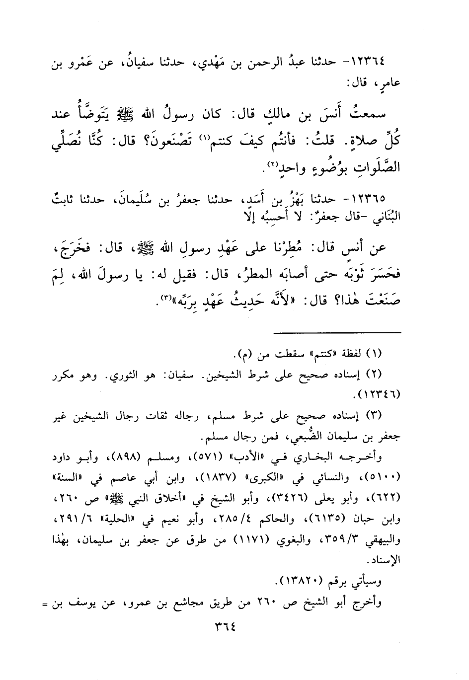 ١٢٣٦٤ - حَدَّثَنَا عَبْدُ الرَّحْمَنِ بْنُ مَهْدِيٍّ، حَدَّثَنَا سُفْيَانُ، عَنْ عَمْرِو بْنِ عَامِرٍ قَالَ: سَمِعْتُ أَنَسَ بْنَ مَالِكٍ قَالَ: " كَانَ رَسُولُ اللهِ صَلَّى اللهُ عَلَيْهِ وَسَلَّمَ يَتَوَضَّأُ عِنْدَ كُلِّ صَلَاةٍ " قُلْتُ: فَأَنْتُمْ كَيْفَ كنتم (١) تَصْنَعُونَ؟ قَالَ: " كُنَّا نُصَلِّي الصَّلَوَاتِ بِوُضُوءٍ وَاحِدٍ " (٢)
