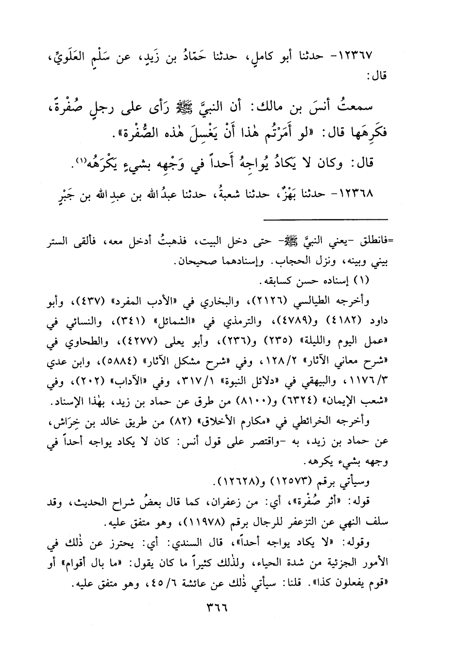 ١٢٣٦٧ - حَدَّثَنَا أَبُو كَامِلٍ، حَدَّثَنَا حَمَّادُ بْنُ زَيْدٍ، عَنْ سَلْمٍ الْعَلَوِيِّ قَالَ: سَمِعْتُ أَنَسَ بْنَ مَالِكٍ، أَنَّ النَّبِيَّ صَلَّى اللهُ عَلَيْهِ وَسَلَّمَ رَأَى عَلَى رَجُلٍ صُفْرَةً فَكَرِهَهَا، قَالَ: " لَوْ أَمَرْتُمْ هَذَا أَنْ يَغْسِلَ هَذِهِ الصُّفْرَةَ ". قَالَ: وَكَانَ لَا يَكَادُ يُوَاجِهُ أَحَدًا فِي وَجْهِهِ بِشَيْءٍ يَكْرَهُهُ (١)