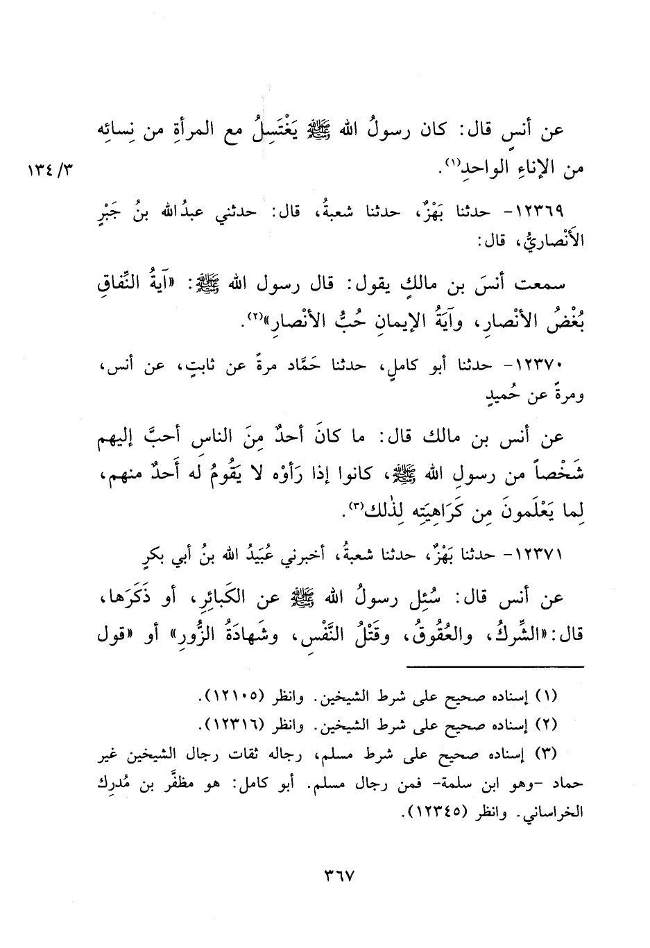 ١٢٣٦٩ - حَدَّثَنَا بَهْزٌ، حَدَّثَنَا شُعْبَةُ قَالَ: حَدَّثَنِي عَبْدُ اللهِ بْنُ جَبْرٍ الْأَنْصَارِيُّ قَالَ: سَمِعْتُ أَنَسَ بْنَ مَالِكٍ يَقُولُ: قَالَ رَسُولُ اللهِ صَلَّى اللهُ عَلَيْهِ وَسَلَّمَ: " آيَةُ النِّفَاقِ بُغْضُ الْأَنْصَارِ، وَآيَةُ الْإِيمَانِ حُبُّ الْأَنْصَارِ " (٢)