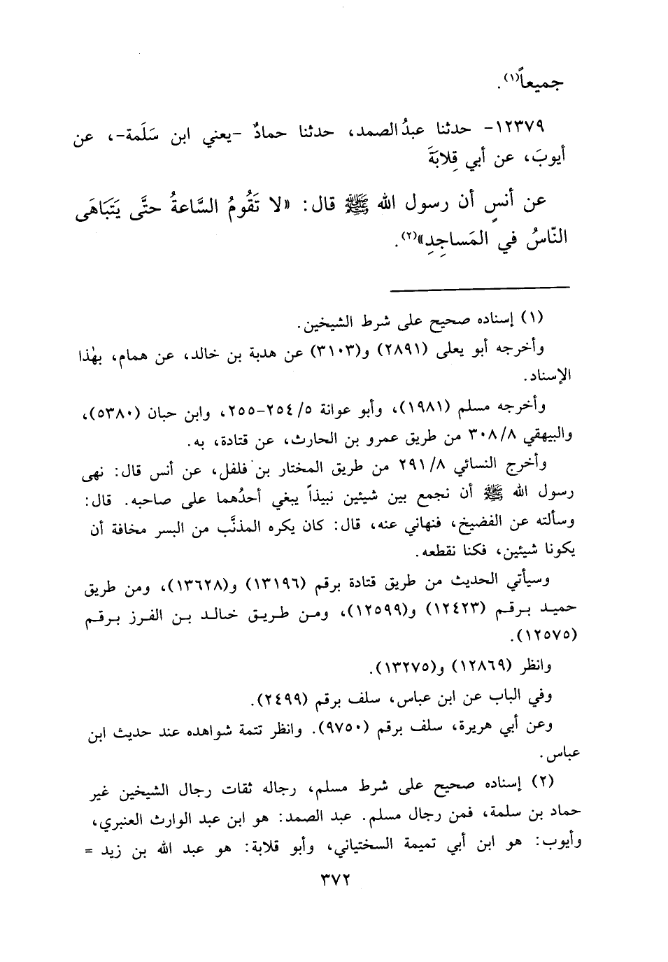 ١٢٣٧٩ - حَدَّثَنَا عَبْدُ الصَّمَدِ، حَدَّثَنَا حَمَّادٌ يَعْنِي ابْنَ سَلَمَةَ، عَنْ أَيُّوبَ، عَنْ أَبِي قِلَابَةَ، عَنْ أَنَسٍ، أَنَّ رَسُولَ اللهِ صَلَّى اللهُ عَلَيْهِ وَسَلَّمَ قَالَ: " لَا تَقُومُ السَّاعَةُ حَتَّى يَتَبَاهَى النَّاسُ فِي الْمَسَاجِدِ " (٢)