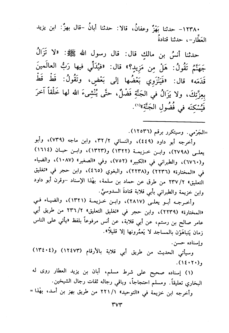 ١٢٣٨٠ - حَدَّثَنَا بَهْزٌ، وَعَفَّانُ، قَالَا: حَدَّثَنَا أَبَانُ، قَالَ بَهْزُ بْنُ يَزِيدَ الْعَطَّارُ: حَدَّثَنَا قَتَادَةُ، حَدَّثَنَا أَنَسُ بْنُ مَالِكٍ قَالَ: قَالَ رَسُولُ اللهِ صَلَّى اللهُ عَلَيْهِ وَسَلَّمَ: " لَا تَزَالُ جَهَنَّمُ تَقُولُ: هَلْ مِنْ مَزِيدٍ؟ قَالَ: فَيُدَلِّي فِيهَا رَبُّ الْعَالَمِينَ قَدَمَهُ، قَالَ: فَيَنْزَوِي بَعْضُهَا إِلَى بَعْضٍ "، وَتَقُولُ: قَطْ قَطْ بِعِزَّتِكَ، وَلَا يَزَالُ فِي الْجَنَّةِ فَضْلٌ، حَتَّى يُنْشِئَ اللهُ لَهَا خَلْقًا آخَرَ فَيُسْكِنَهُ فِي فُضُولِ الْجَنَّةِ " (١)
