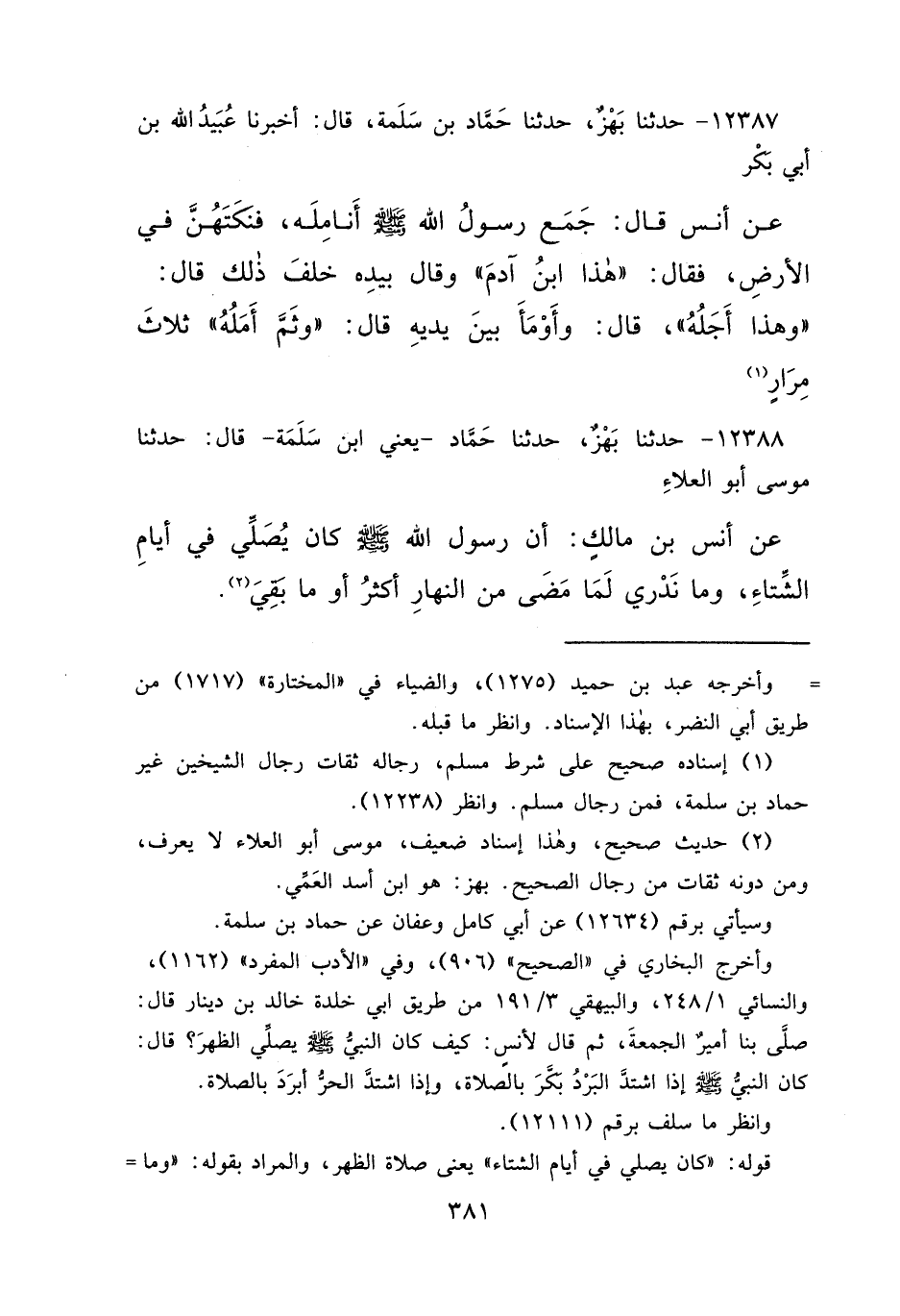 ١٢٣٨٨ - حَدَّثَنَا بَهْزٌ، حَدَّثَنَا حَمَّادٌ يَعْنِي ابْنَ سَلَمَةَ قَالَ: حَدَّثَنَا مُوسَى أَبُو الْعَلَاءِ، عَنْ أَنَسِ بْنِ مَالِكٍ، " أَنَّ رَسُولَ اللهِ صَلَّى اللهُ عَلَيْهِ وَسَلَّمَ كَانَ يُصَلِّي فِي أَيَّامِ الشِّتَاءِ، وَمَا نَدْرِي لَمَا مَضَى مِنَ النَّهَارِ أَكْثَرُ، أَوْ مَا بَقِيَ " (٢)