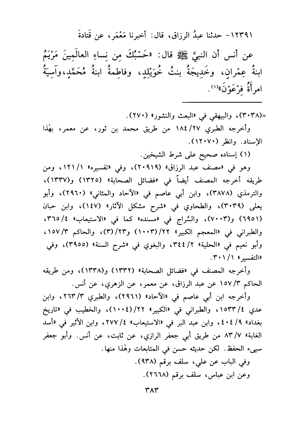 ١٢٣٩١ - حَدَّثَنَا عَبْدُ الرَّزَّاقِ قَالَ: أَخْبَرَنَا مَعْمَرٌ، عَنْ قَتَادَةَ، عَنْ أَنَسٍ، أَنَّ النَّبِيَّ صَلَّى اللهُ عَلَيْهِ وَسَلَّمَ قَالَ: " حَسْبُكَ مِنْ نِسَاءِ الْعَالَمِينَ مَرْيَمُ ابْنَةُ عِمْرَانَ، وَخَدِيجَةُ بِنْتُ خُوَيْلِدٍ، وَفَاطِمَةُ ابْنَةُ مُحَمَّدٍ، وَآسِيَةُ امْرَأَةُ فِرْعَوْنَ " (١)