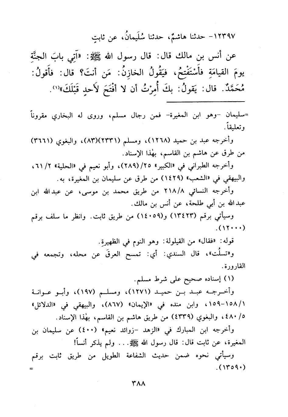١٢٣٩٧ - حَدَّثَنَا هَاشِمٌ، حَدَّثَنَا سُلَيْمَانُ، عَنْ ثَابِتٍ، عَنْ أَنَسِ بْنِ مَالِكٍ قَالَ: قَالَ رَسُولُ اللهِ صَلَّى اللهُ عَلَيْهِ وَسَلَّمَ: " آتِي بَابَ الْجَنَّةِ يَوْمَ الْقِيَامَةِ فَأَسْتَفْتِحُ، فَيَقُولُ الْخَازِنُ: مَنْ أَنْتَ؟ قَالَ: فَأَقُولُ: مُحَمَّدٌ قَالَ: يَقُولُ: بِكَ أُمِرْتُ أَنْ لَا أَفْتَحَ لِأَحَدٍ قَبْلَكَ " (١)