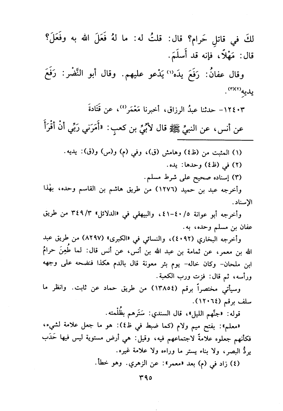 لَكَ فِي قَاتِلِ حَرَامٍ؟ قَالَ: قُلْتُ لَهُ: مَا لَهُ فَعَلَ اللهُ بِهِ وَفَعَلَ قَالَ: مَهْلًا، فَإِنَّهُ قَدْ أَسْلَمَ، وَقَالَ عَفَّانُ: رَفَعَ يَدَهُ (١) يَدْعُو عَلَيْهِمْ، وقَالَ أَبُو النَّضْرِ: رَفَعَ يَدَيْهِ (٢) (٣)