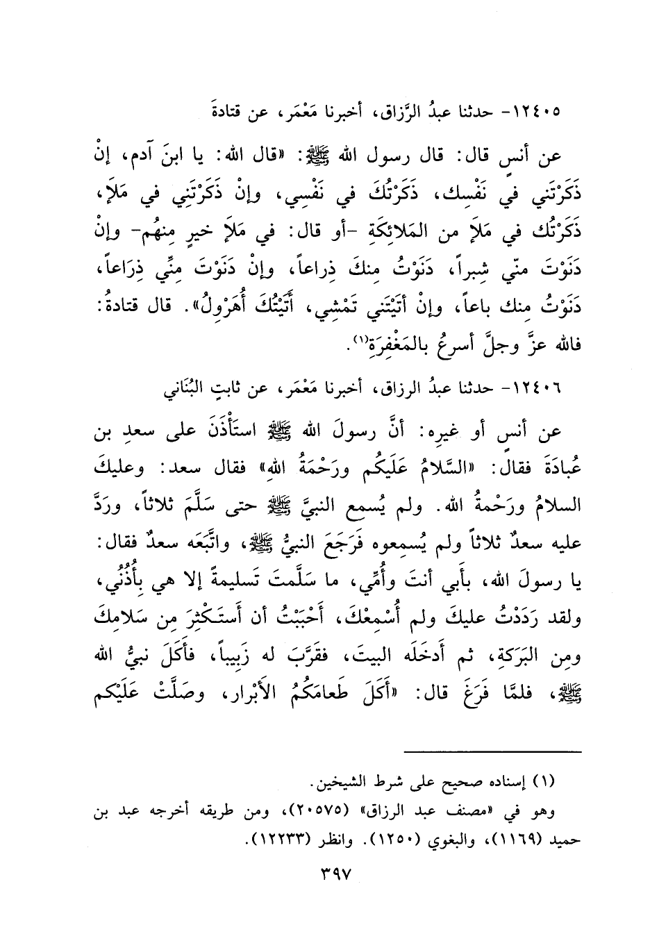 ١٢٤٠٥ - حَدَّثَنَا عَبْدُ الرَّزَّاقِ، أَخْبَرَنَا مَعْمَرٌ، عَنْ قَتَادَةَ، عَنْ أَنَسٍ قَالَ: قَالَ رَسُولُ اللهِ صَلَّى اللهُ عَلَيْهِ وَسَلَّمَ: " قَالَ اللهُ: يَا ابْنَ آدَمَ، إِنْ ذَكَرْتَنِي فِي نَفْسِكَ ذَكَرْتُكَ فِي نَفْسِي، وَإِنْ ذَكَرْتَنِي فِي مَلَإٍ ذَكَرْتُكَ فِي مَلَإٍ مِنَ الْمَلَائِكَةِ، أَوْ فِي مَلَإٍ خَيْرٍ مِنْهُمْ، وَإِنْ دَنَوْتَ مِنِّي شِبْرًا، دَنَوْتُ مِنْكَ ذِرَاعًا، وَإِنْ دَنَوْتَ مِنِّي ذِرَاعًا، دَنَوْتُ مِنْكَ بَاعًا، وَإِنْ أَتَيْتَنِي تَمْشِي، أَتَيْتُكَ أُهَرْوِلُ " قَالَ قَتَادَةُ: " فَاللهُ عَزَّ وَجَلَّ أَسْرَعُ بِالْمَغْفِرَةِ " (١)