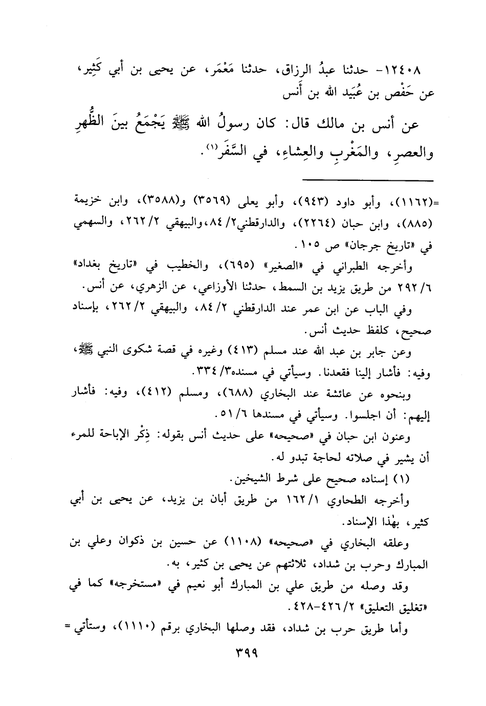 ١٢٤٠٨ - حَدَّثَنَا عَبْدُ الرَّزَّاقِ، حَدَّثَنَا مَعْمَرٌ، عَنْ يَحْيَى بْنِ أَبِي كَثِيرٍ، عَنْ حَفْصِ بْنِ عُبَيْدِ اللهِ بْنِ أَنَسٍ، عَنْ أَنَسِ بْنِ مَالِكٍ قَالَ: " كَانَ رَسُولُ اللهِ صَلَّى اللهُ عَلَيْهِ وَسَلَّمَ يَجْمَعُ بَيْنَ الظُّهْرِ وَالْعَصْرِ، وَالْمَغْرِبِ وَالْعِشَاءِ، فِي السَّفَرِ " (١)