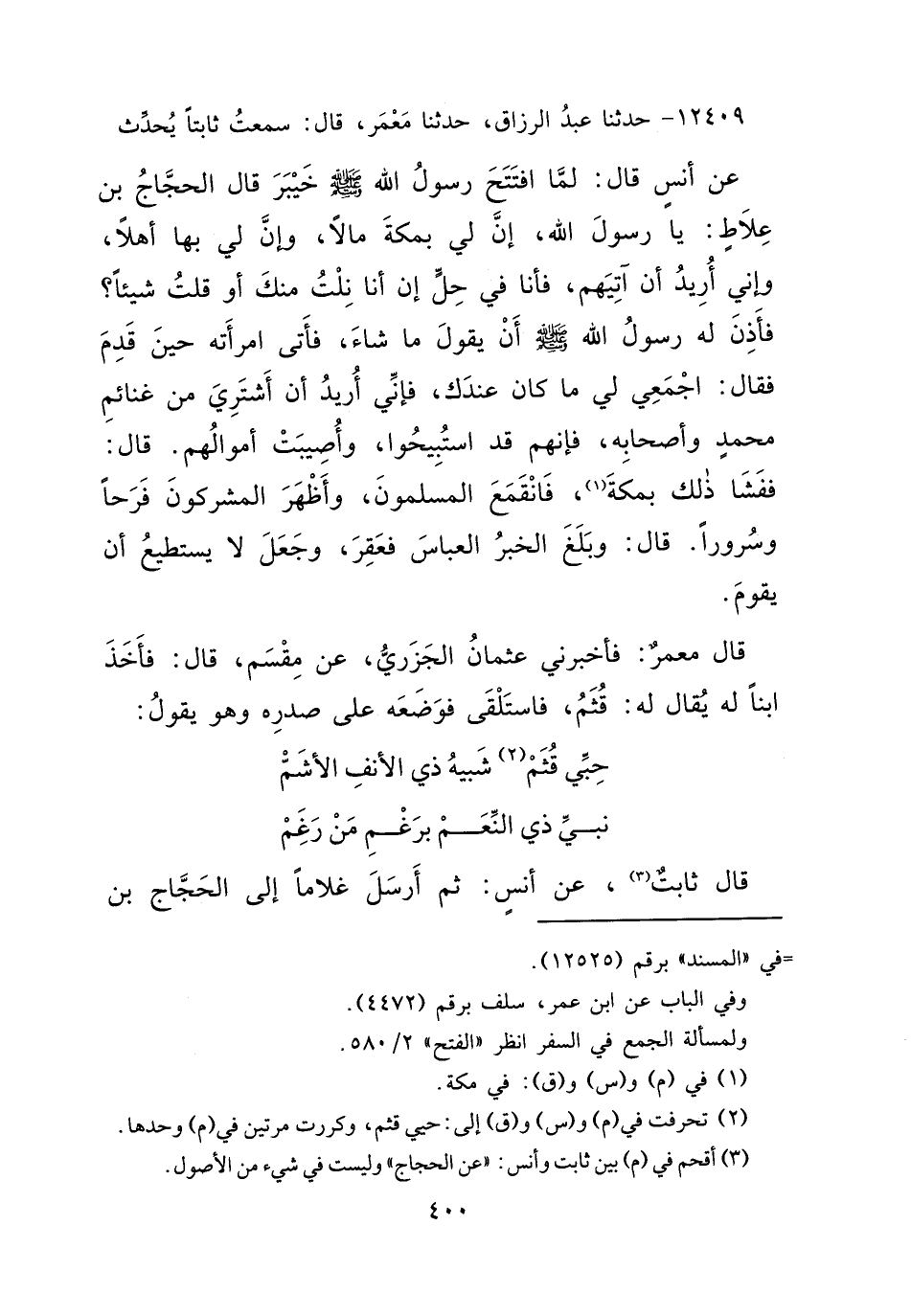 ١٢٤٠٩ - حَدَّثَنَا عَبْدُ الرَّزَّاقِ، حَدَّثَنَا مَعْمَرٌ قَالَ: سَمِعْتُ ثَابِتًا، يُحَدِّثُ، عَنْ أَنَسٍ قَالَ: لَمَّا افْتَتَحَ رَسُولُ اللهِ صَلَّى اللهُ عَلَيْهِ وَسَلَّمَ خَيْبَرَ قَالَ الْحَجَّاجُ بْنُ عِلَاطٍ: يَا رَسُولَ اللهِ، إِنَّ لِي بِمَكَّةَ مَالًا، وَإِنَّ لِي بِهَا أَهْلًا، وَإِنِّي أُرِيدُ أَنْ آتِيَهُمْ، فَأَنَا فِي حِلٍّ إِنْ أَنَا نِلْتُ مِنْكَ، أَوْ قُلْتُ شَيْئًا؟ " فَأَذِنَ لَهُ رَسُولُ اللهِ صَلَّى اللهُ عَلَيْهِ وَسَلَّمَ أَنْ يَقُولَ مَا شَاءَ "، فَأَتَى امْرَأَتَهُ حِينَ قَدِمَ فَقَالَ: اجْمَعِي لِي مَا كَانَ عِنْدَكِ، فَإِنِّي أُرِيدُ أَنْ أَشْتَرِيَ مِنْ غَنَائِمِ مُحَمَّدٍ صَلَّى اللهُ عَلَيْهِ وَسَلَّمَ، وَأَصْحَابِهِ، فَإِنَّهُمْ قَدِ اسْتُبِيحُوا وَأُصِيبَتْ أَمْوَالُهُمْ، قَالَ: فَفَشَا ذَلِكَ بِمَكَّةَ، (١) ، فانْقَمَعَ الْمُسْلِمُونَ، وَأَظْهَرَ الْمُشْرِكُونَ فَرَحًا وَسُرُورًا قَالَ: وَبَلَغَ الْخَبَرُ الْعَبَّاسَ فَعَقِرَ، وَجَعَلَ لَا يَسْتَطِيعُ أَنْ يَقُومَ، قَالَ مَعْمَرٌ: فَأَخْبَرَنِي عُثْمَانُ الْجَزَرِيُّ، عَنْ مِقْسَمٍ قَالَ: فَأَخَذَ ابْنًا لَهُ يُقَالُ لَهُ: قُثَمُ، فَاسْتَلْقَى فَوَضَعَهُ عَلَى صَدْرِهِ وَهُوَ يَقُولُ: