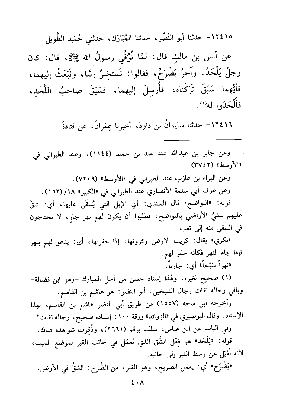 ١٢٤١٥ - حَدَّثَنَا أَبُو النَّضْرِ، حَدَّثَنَا الْمُبَارَكُ، حَدَّثَنِي حُمَيْدٌ الطَّوِيلُ، عَنْ أَنَسِ بْنِ مَالِكٍ قَالَ: لَمَّا تُوُفِّيَ رَسُولُ اللهِ صَلَّى اللهُ عَلَيْهِ وَسَلَّمَ قَالَ: " كَانَ رَجُلٌ يَلْحَدُ وَآخَرُ يَضْرَحُ، فَقَالُوا: نَسْتَخِيرُ رَبَّنَا، وَنَبْعَثُ إِلَيْهِمَا، فَأَيُّهُمَا سَبَقَ تَرَكْنَاهُ، فَأَرْسَلَ إِلَيْهِمَا، فَسَبَقَ صَاحِبُ اللَّحْدِ فَأَلْحَدُوا لَهُ " (١)