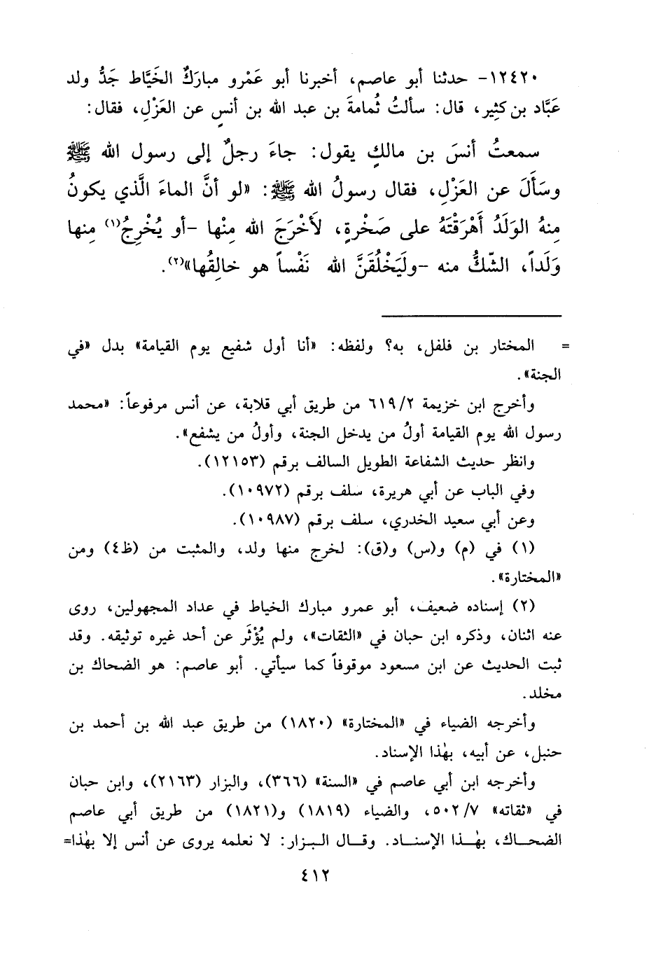 ١٢٤٢٠ - حَدَّثَنَا أَبُو عَاصِمٍ، أَخْبَرَنَا أَبُو عَمْرٍو مُبَارَكٌ الْخَيَّاطُ جَدُّ وَلَدِ عَبَّادِ بْنِ كَثِيرٍ قَالَ: سَأَلْتُ ثُمَامَةَ بْنَ عَبْدِ اللهِ بْنِ أَنَسٍ عَنِ الْعَزْلِ، فَقَالَ: سَمِعْتُ أَنَسَ بْنَ مَالِكٍ يَقُولُ: جَاءَ رَجُلٌ إِلَى رَسُولِ اللهِ صَلَّى اللهُ عَلَيْهِ وَسَلَّمَ وَسَأَلَ عَنِ الْعَزْلِ، فَقَالَ رَسُولُ اللهِ صَلَّى اللهُ عَلَيْهِ وَسَلَّمَ: " لَوْ أَنَّ الْمَاءَ الَّذِي يَكُونُ مِنْهُ الْوَلَدُ أَهْرَقْتَهُ عَلَى صَخْرَةٍ، لَأَخْرَجَ اللهُ مِنْهَا - أَوْ يُخْرِجُ (١) مِنْهَا وَلَدًا الشَّكُّ مِنْهُ - وَلَيَخْلُقَنَّ اللهُ نَفْسًا هُوَ خَالِقُهَا " (٢)