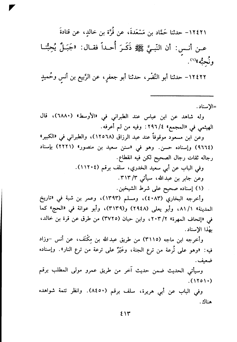 ١٢٤٢١ - حَدَّثَنَا حَمَّادُ بْنُ مَسْعَدَةَ، عَنْ قُرَّةَ بْنِ خَالِدٍ، عَنْ قَتَادَةَ، عَنْ أَنَسٍ، أَنَّ النَّبِيَّ صَلَّى اللهُ عَلَيْهِ وَسَلَّمَ ذَكَرَ أُحُدًا، فَقَالَ: " جَبَلٌ يُحِبُّنَا وَنُحِبُّهُ " (١)