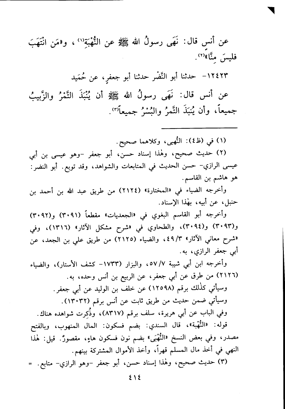 عَنْ أَنَسٍ قَالَ: نَهَى رَسُولُ اللهِ صَلَّى اللهُ عَلَيْهِ وَسَلَّمَ عَنِ النُّهْبَةِ (١) ، " وَمَنْ انْتَهَبَ فَلَيْسَ مِنَّا " (٢)