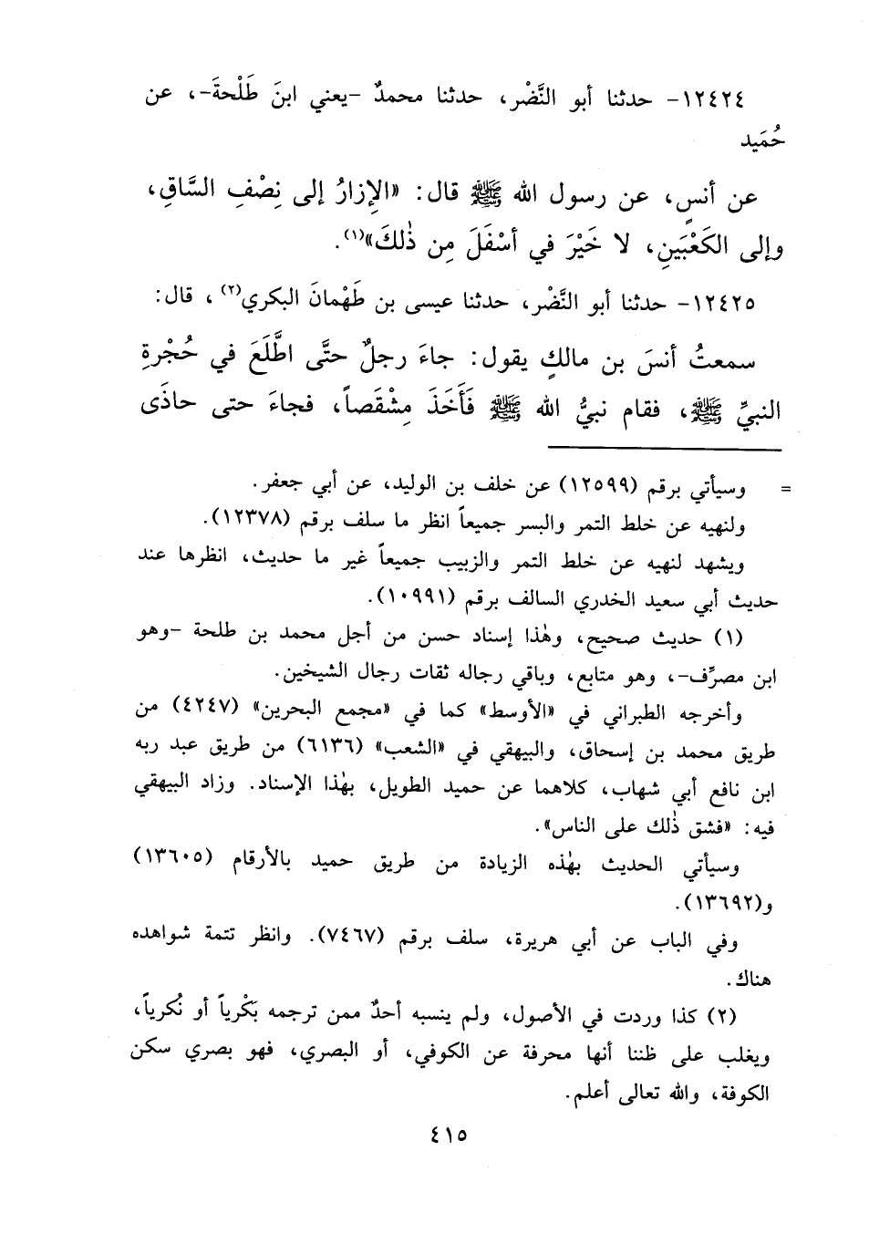 ١٢٤٢٤ - حَدَّثَنَا أَبُو النَّضْرِ، حَدَّثَنَا مُحَمَّدٌ يَعْنِي ابْنَ طَلْحَةَ، عَنْ حُمَيْدٍ، عَنْ أَنَسٍ، عَنْ رَسُولِ اللهِ صَلَّى اللهُ عَلَيْهِ وَسَلَّمَ قَالَ: " الْإِزَارُ إِلَى نِصْفِ السَّاقِ وَإِلَى الْكَعْبَيْنِ، لَا خَيْرَ فِي أَسْفَلَ مِنْ ذَلِكَ " (١)