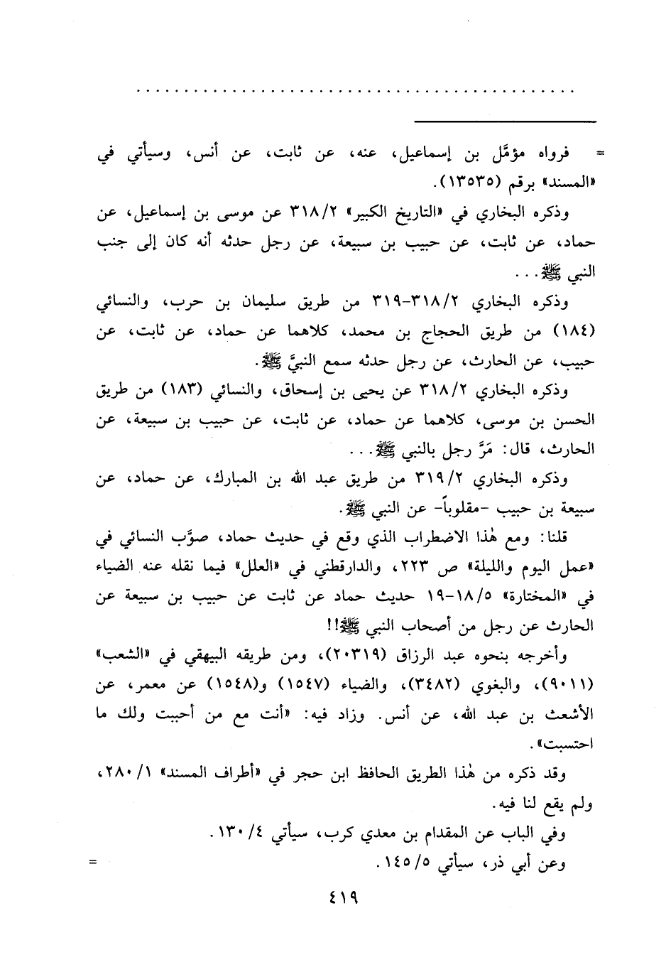 وذكره البخاري ٢/٣١٨ عن يحيي بن إسحاق، والنسائي (١٨٣) من طريق الحسن بن موسى، كلاهما عن حماد، عن ثابت، عن حبيب بن سبيعة، عن الحارث، قال: مر رجل بالنبي صَلَّى اللهُ عَلَيْهِ وَسَلَّمَ ...