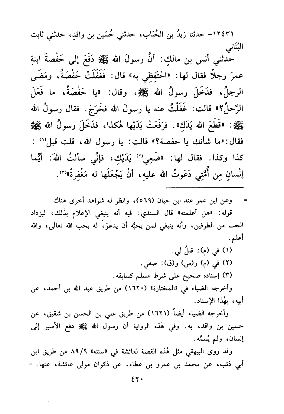 ١٢٤٣١ - حَدَّثَنَا زَيْدُ بْنُ الْحُبَابِ، حَدَّثَنِي حُسَيْنُ بْنُ وَاقِدٍ، حَدَّثَنِي ثَابِتٌ البُنَانِيُّ، حَدَّثَنِي أَنَسُ بْنُ مَالِكٍ، أَنَّ رَسُولَ اللهِ صَلَّى اللهُ عَلَيْهِ وَسَلَّمَ دَفَعَ إِلَى حَفْصَةَ ابْنَةِ عُمَرَ رَجُلًا، فَقَالَ لَهَا: " احْتَفِظِي بِهِ ". قَالَ: فَغَفَلَتْ حَفْصَةُ، وَمَضَى الرَّجُلُ، فَدَخَلَ رَسُولُ اللهِ صَلَّى اللهُ عَلَيْهِ وَسَلَّمَ، وَقَالَ: " يَا حَفْصَةُ، مَا فَعَلَ الرَّجُلُ؟ " قَالَتْ: غَفَلْتُ عَنْهُ يَا رَسُولَ اللهِ، فَخَرَجَ، فَقَالَ رَسُولُ اللهِ صَلَّى اللهُ عَلَيْهِ وَسَلَّمَ: " قَطَعَ اللهُ يَدَكِ "، فَرَفَعَتْ يَدَيْهَا هَكَذَا، فَدَخَلَ رَسُولُ اللهِ صَلَّى اللهُ عَلَيْهِ وَسَلَّمَ فَقَالَ: " مَا شَأْنُكِ يَا حَفْصَةُ؟ " قَالَتْ: يَا رَسُولَ اللهِ، قُلْتَ: قَبْلُ (١) كَذَا وَكَذَا، فَقَالَ لَهَا: " ضَعِي (٢) يَدَيْكِ، فَإِنِّي سَأَلْتُ اللهَ: أَيُّمَا إِنْسَانٍ مِنْ أُمَّتِي دَعَوْتُ اللهَ عَلَيْهِ، أَنْ يَجْعَلَهَا لَهُ مَغْفِرَةً " (٣)