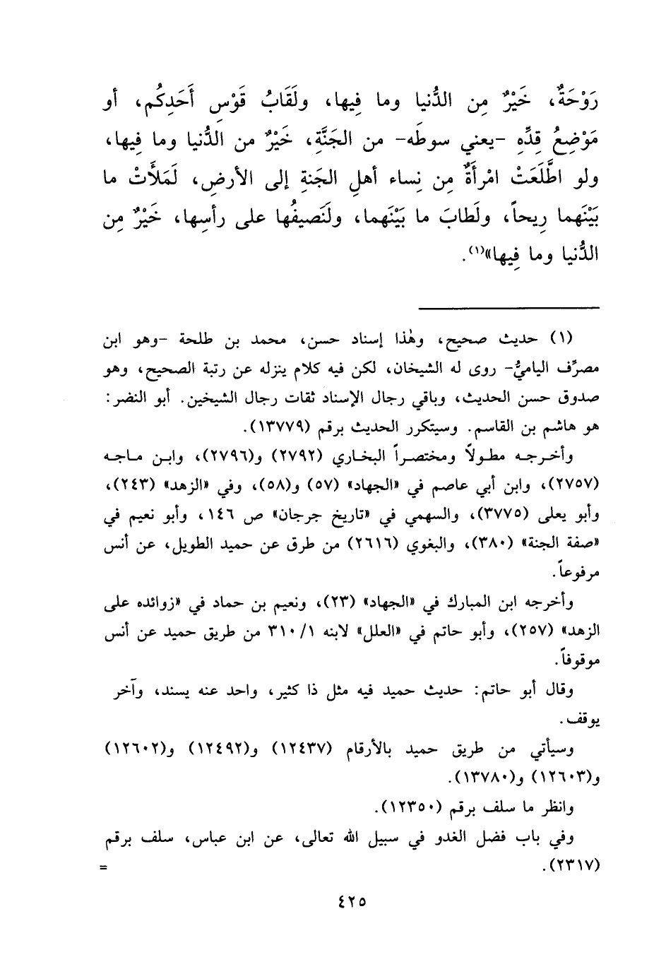 رَوْحَةٌ خَيْرٌ مِنَ الدُّنْيَا وَمَا فِيهَا، وَلَقَابُ قَوْسِ أَحَدِكُمْ أَوْ مَوْضِعُ قَدِّهِ - يَعْنِي سَوْطَهُ - مِنَ الْجَنَّةِ، خَيْرٌ مِنَ الدُّنْيَا وَمَا فِيهَا، وَلَوِ اطَّلَعَتْ امْرَأَةٌ مِنْ نِسَاءِ أَهْلِ الْجَنَّةِ إِلَى الْأَرْضِ لَمَلَأَتْ مَا بَيْنَهُمَا رِيحًا، وَلَطَابَ مَا بَيْنَهُمَا وَلَنَصِيفُهَا عَلَى رَأْسِهَا خَيْرٌ مِنَ الدُّنْيَا وَمَا فِيهَا " (١)