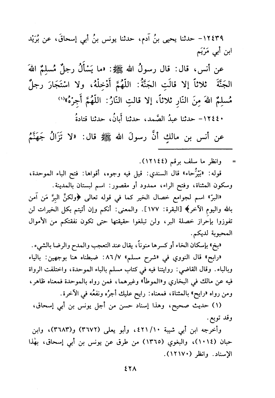 ١٢٤٣٩ - حَدَّثَنَا يَحْيَى بْنُ آدَمَ، حَدَّثَنَا يُونُسُ بْنُ أَبِي إِسْحَاقَ، عَنْ بُرَيْدِ بْنِ أَبِي مَرْيَمَ، عَنْ أَنَسٍ قَالَ: قَالَ رَسُولُ اللهِ صَلَّى اللهُ عَلَيْهِ وَسَلَّمَ: " مَا يَسْأَلُ رَجُلٌ مُسْلِمٌ اللهَ الْجَنَّةَ ثَلَاثًا، إِلَّا قَالَتِ الْجَنَّةُ: اللهُمَّ أَدْخِلْهُ. وَلَا اسْتَجَارَ رَجُلٌ مُسْلِمٌ اللهَ مِنَ النَّارِ ثَلَاثًا، إِلَّا قَالَتِ النَّارُ: اللهُمَّ أَجِرْهُ " (١)