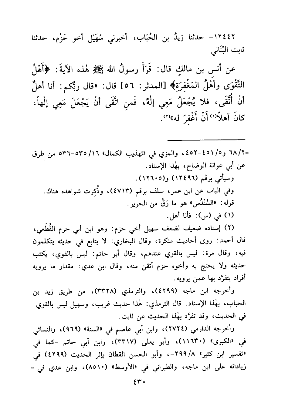 ١٢٤٤٢ - حَدَّثَنَا زَيْدُ بْنُ الْحُبَابِ، أَخْبَرَنِي سُهَيْلٌ، أَخُو حَزْمٍ، حَدَّثَنَا ثَابِتٌ الْبُنَانِيُّ، عَنْ أَنَسِ بْنِ مَالِكٍ قَالَ: قَرَأَ رَسُولُ اللهِ صَلَّى اللهُ عَلَيْهِ وَسَلَّمَ، هَذِهِ الْآيَةَ: {أَهْلُ التَّقْوَى وَأَهْلُ الْمَغْفِرَةِ} [المدثر: ٥٦] قَالَ: " قَالَ رَبُّكُمْ: أَنَا أَهْلٌ أَنْ أُتَّقَى، فَلَا يُجْعَلْ مَعِي إِلَهٌ، فَمَنْ اتَّقَى أَنْ يَجْعَلَ مَعِي إِلَهًا، كَانَ أَهْلًا (١) أَنْ أَغْفِرَ لَهُ " (٢)