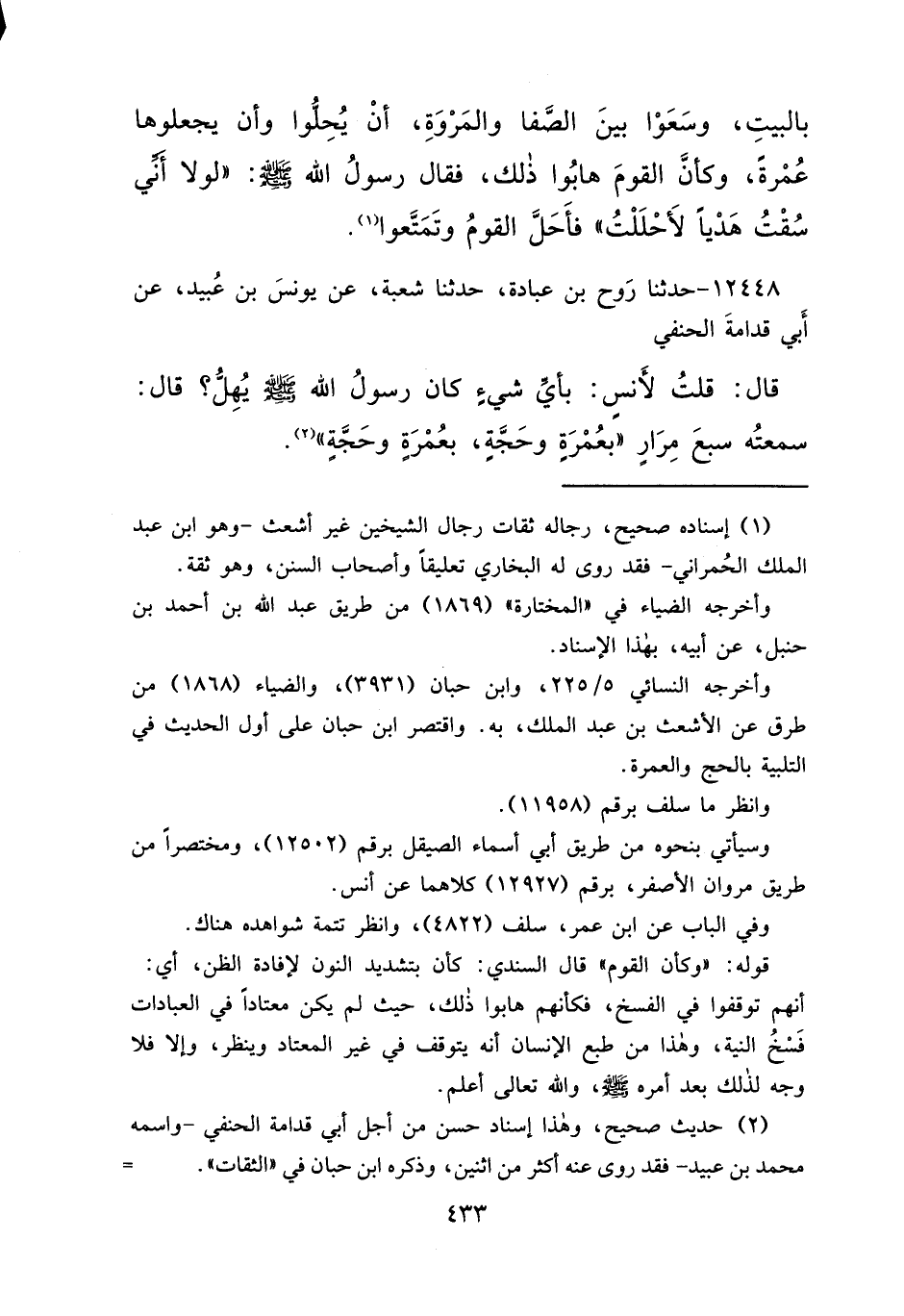 ١٢٤٤٨ - حَدَّثَنَا رَوْحُ بْنُ عُبَادَةَ، حَدَّثَنَا شُعْبَةُ، عَنْ يُونُسَ بْنِ عُبَيْدٍ، عَنْ أَبِي قُدَامَةَ الْحَنَفِيِّ، قَالَ: قُلْتُ لِأَنَسٍ: بِأَيِّ شَيْءٍ كَانَ رَسُولُ اللهِ صَلَّى اللهُ عَلَيْهِ وَسَلَّمَ يُهِلُّ؟ قَالَ: سَمِعْتُهُ سَبْعَ مِرَارٍ " بِعُمْرَةٍ وَحَجَّةٍ، بِعُمْرَةٍ وَحَجَّةٍ " (٢)