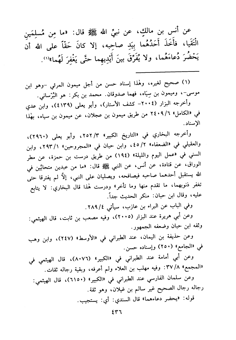 عَنْ أَنَسِ بْنِ مَالِكٍ، عَنْ نَبِيِّ اللهِ صَلَّى اللهُ عَلَيْهِ وَسَلَّمَ قَالَ: " مَا مِنْ مُسْلِمَيْنِ الْتَقَيَا، فَأَخَذَ أَحَدُهُمَا بِيَدِ صَاحِبِهِ، إِلَّا كَانَ حَقًّا عَلَى اللهِ أَنْ يَحْضُرَ دُعَاءَهُمَا، وَلَا يُفَرِّقَ بَيْنَ أَيْدِيهِمَا حَتَّى يَغْفِرَ لَهُمَا " (١)