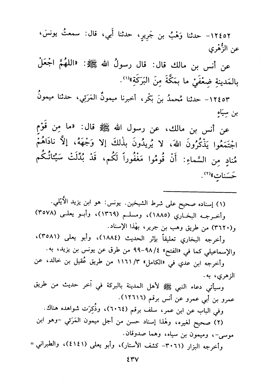 ١٢٤٥٢ - حَدَّثَنَا وَهْبُ بْنُ جَرِيرٍ، حَدَّثَنَا أَبِي قَالَ: سَمِعْتُ يُونُسَ، عَنِ الزُّهْرِيِّ، عَنْ أَنَسِ بْنِ مَالِكٍ قَالَ: قَالَ رَسُولُ اللهِ صَلَّى اللهُ عَلَيْهِ وَسَلَّمَ: " اللهُمَّ اجْعَلْ بِالْمَدِينَةِ ضِعْفَيْ مَا بِمَكَّةَ مِنَ الْبَرَكَةِ " (١)