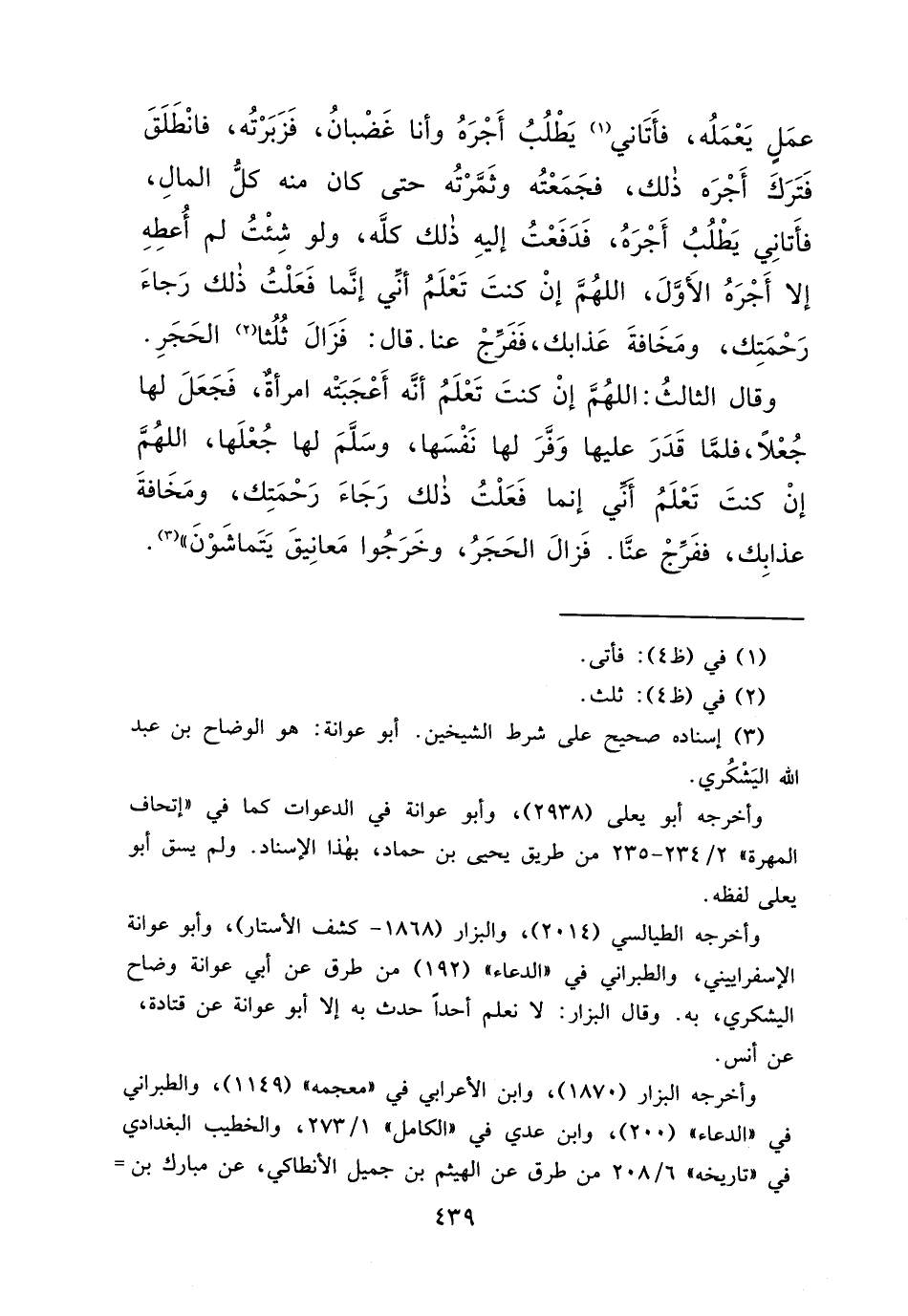 عَمَلٍ يَعْمَلُهُ، فَأَتَانِي (١) يَطْلُبُ أَجْرَهُ، وَأَنَا غَضْبَانُ فَزَبَرْتُهُ، فَانْطَلَقَ فَتَرَكَ أَجْرَهُ ذَلِكَ، فَجَمَعْتُهُ وَثَمَّرْتُهُ حَتَّى كَانَ مِنْهُ كُلُّ الْمَالِ، فَأَتَانِي يَطْلُبُ أَجْرَهُ، فَدَفَعْتُ إِلَيْهِ ذَلِكَ كُلَّهُ، وَلَوْ شِئْتُ لَمْ أُعْطِهِ، إِلَّا أَجْرَهُ الْأَوَّلَ، اللهُمَّ إِنْ كُنْتَ تَعْلَمُ أَنِّي إِنَّمَا فَعَلْتُ ذَلِكَ رَجَاءَ رَحْمَتِكَ، وَمَخَافَةَ عَذَابِكَ، فَفَرِّجْ عَنَّا، قَالَ: فَزَالَ ثُلُثَا (٢) الْحَجَرِ. وَقَالَ الثَّالِثُ: اللهُمَّ إِنْ كُنْتَ تَعْلَمُ أَنَّهُ أَعْجَبَتْهُ امْرَأَةٌ، فَجَعَلَ لَهَا جُعْلًا، فَلَمَّا قَدَرَ عَلَيْهَا وَقَّرَ لَهَا نَفْسَهَا وَسَلَّمَ لَهَا جُعْلَهَا، اللهُمَّ إِنْ كُنْتَ تَعْلَمُ أَنِّي إِنَّمَا فَعَلْتُ ذَلِكَ رَجَاءَ رَحْمَتِكَ، وَمَخَافَةَ عَذَابِكَ، فَفَرِّجْ عَنَّا، فَزَالَ الْحَجَرُ، وَخَرَجُوا مَعَانِيقَ يَتَمَاشَوْنَ (٣)