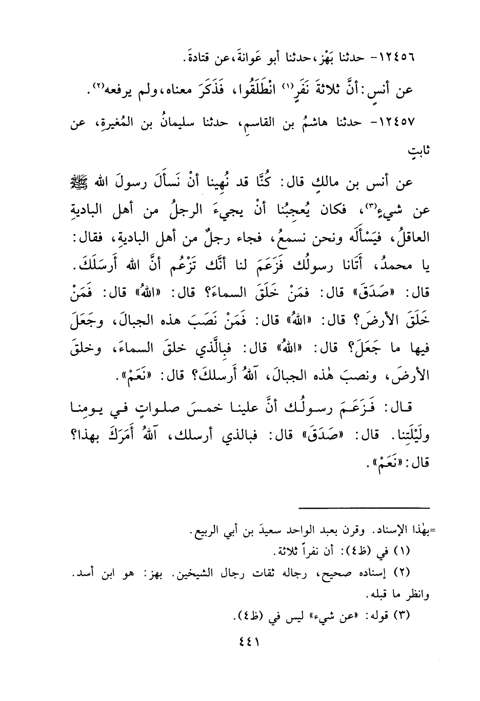 ١٢٤٥٧ - حَدَّثَنَا هَاشِمُ بْنُ الْقَاسِمِ، حَدَّثَنَا سُلَيْمَانُ بْنُ الْمُغِيرَةِ، عَنْ ثَابِتٍ، عَنْ أَنَسِ بْنِ مَالِكٍ قَالَ: كُنَّا قَدْ نُهِينَا أَنْ نَسْأَلَ رَسُولَ اللهِ صَلَّى اللهُ عَلَيْهِ وَسَلَّمَ عَنْ شَيْءٍ (٣) ، فَكَانَ يُعْجِبُنَا أَنْ يَجِيءَ الرَّجُلُ مِنْ أَهْلِ الْبَادِيَةِ الْعَاقِلُ، فَيَسْأَلُهُ وَنَحْنُ نَسْمَعُ، فَجَاءَ رَجُلٌ مِنْ أَهْلِ الْبَادِيَةِ، فَقَالَ: يَا مُحَمَّدُ، أَتَانَا رَسُولُكَ فَزَعَمَ لَنَا أَنَّكَ تَزْعُمُ أَنَّ اللهَ أَرْسَلَكَ. قَالَ: " صَدَقَ "، قَالَ: فَمَنْ خَلَقَ السَّمَاءَ؟ قَالَ: " اللهُ "، قَالَ: فَمَنْ خَلَقَ الْأَرْضَ؟ قَالَ: " اللهُ "، قَالَ: فَمَنْ نَصَبَ هَذِهِ الْجِبَالَ، وَجَعَلَ فِيهَا مَا جَعَلَ؟ قَالَ: " اللهُ ". قَالَ: فَبِالَّذِي خَلَقَ السَّمَاءَ وَخَلَقَ الْأَرْضَ، وَنَصَبَ هَذِهِ الْجِبَالَ آللَّهُ أَرْسَلَكَ؟ قَالَ: " نَعَمْ ". قَالَ: فَزَعَمَ رَسُولُكَ أَنَّ عَلَيْنَا خَمْسَ صَلَوَاتٍ فِي يَوْمِنَا وَلَيْلَتِنَا، قَالَ: " صَدَقَ ". قَالَ: فَبِالَّذِي أَرْسَلَكَ، آللَّهُ أَمَرَكَ بِهَذَا؟ قَالَ: " نَعَمْ ".
