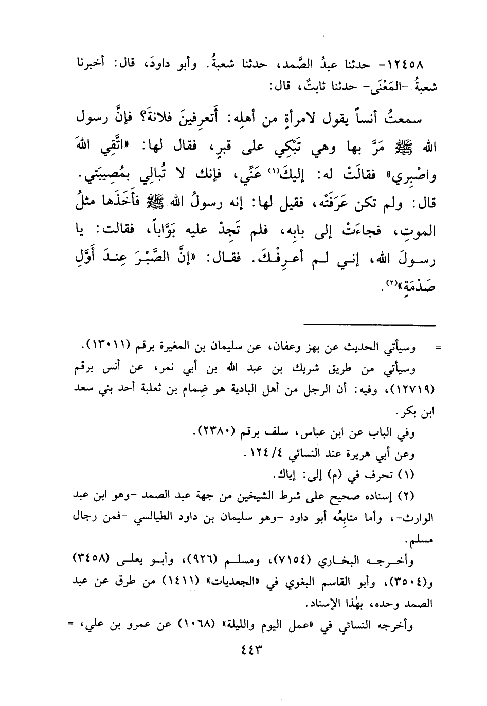 ١٢٤٥٨ - حَدَّثَنَا عَبْدُ الصَّمَدِ، حَدَّثَنَا شُعْبَةُ، وَأَبُو دَاوُدَ قَالَ: أَخْبَرَنَا شُعْبَةُ الْمَعْنَى، حَدَّثَنَا ثَابِتٌ قَالَ: سَمِعْتُ أَنَسًا يَقُولُ لِامْرَأَةٍ مِنْ أَهْلِهِ: أَتَعْرِفِينَ فُلَانَةَ؟ فَإِنَّ رَسُولَ اللهِ صَلَّى اللهُ عَلَيْهِ وَسَلَّمَ مَرَّ بِهَا وَهِيَ تَبْكِي عَلَى قَبْرٍ، فَقَالَ لَهَا: " اتَّقِي اللهَ وَاصْبِرِي "، فَقَالَتْ لَهُ: إِلَيْكَ (١) عَنِّي، فَإِنَّكَ لَا تُبَالِي بِمُصِيبَتِي، قَالَ: وَلَمْ تَكُنْ عَرَفَتْهُ، فَقِيلَ لَهَا: إِنَّهُ رَسُولُ اللهِ صَلَّى اللهُ عَلَيْهِ وَسَلَّمَ، فَأَخَذَهَا مِثْلُ الْمَوْتِ، فَجَاءَتْ إِلَى بَابِهِ، فَلَمْ تَجِدْ عَلَيْهِ بَوَّابًا، فَقَالَتْ: يَا رَسُولَ اللهِ، إِنِّي لَمْ أَعْرِفْكَ، فَقَالَ: " إِنَّ الصَّبْرَ عِنْدَ أَوَّلِ صَدْمَةٍ " (٢)