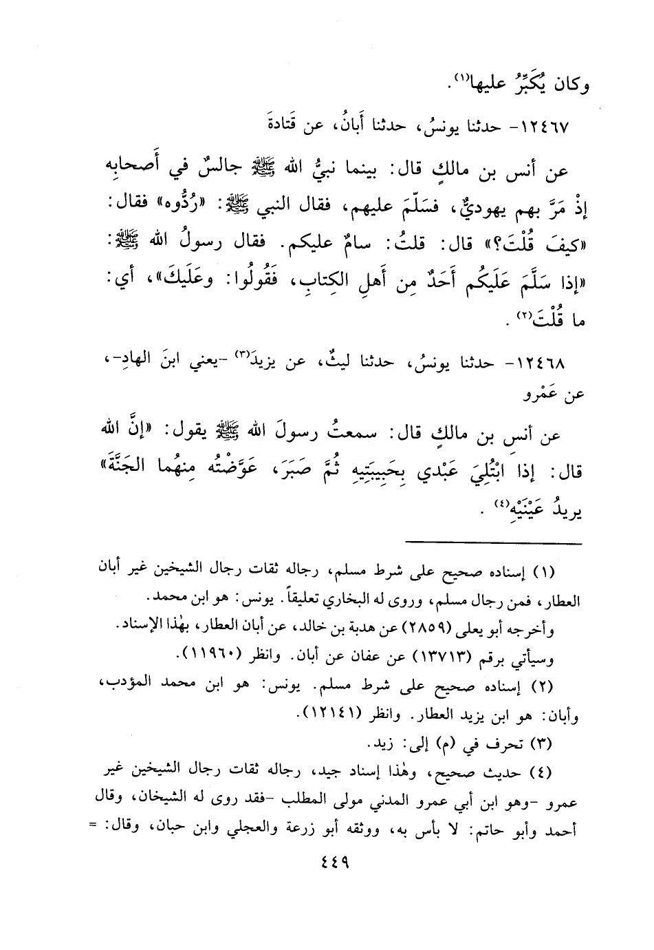 ١٢٤٦٧ - حَدَّثَنَا يُونُسُ، حَدَّثَنَا أَبَانُ، عَنْ قَتَادَةَ، عَنْ أَنَسِ بْنِ مَالِكٍ قَالَ: بَيْنَمَا نَبِيُّ اللهِ صَلَّى اللهُ عَلَيْهِ وَسَلَّمَ جَالِسٌ فِي أَصْحَابِهِ، إِذْ مَرَّ بِهِمْ يَهُودِيٌّ، فَسَلَّمَ عَلَيْهِمْ، فَقَالَ النَّبِيُّ صَلَّى اللهُ عَلَيْهِ وَسَلَّمَ: " رُدُّوهُ "، فَقَالَ: كَيْفَ؟ قُلْتَ: قَالَ: قُلْتُ: سَامٌ عَلَيْكُمْ؟ فَقَالَ رَسُولُ اللهِ صَلَّى اللهُ عَلَيْهِ وَسَلَّمَ: " إِذَا سَلَّمَ عَلَيْكُمْ أَحَدٌ مِنْ أَهْلِ الْكِتَابِ، فَقُولُوا: وَعَلَيْكَ " أَيْ مَا قُلْتَ (٢)