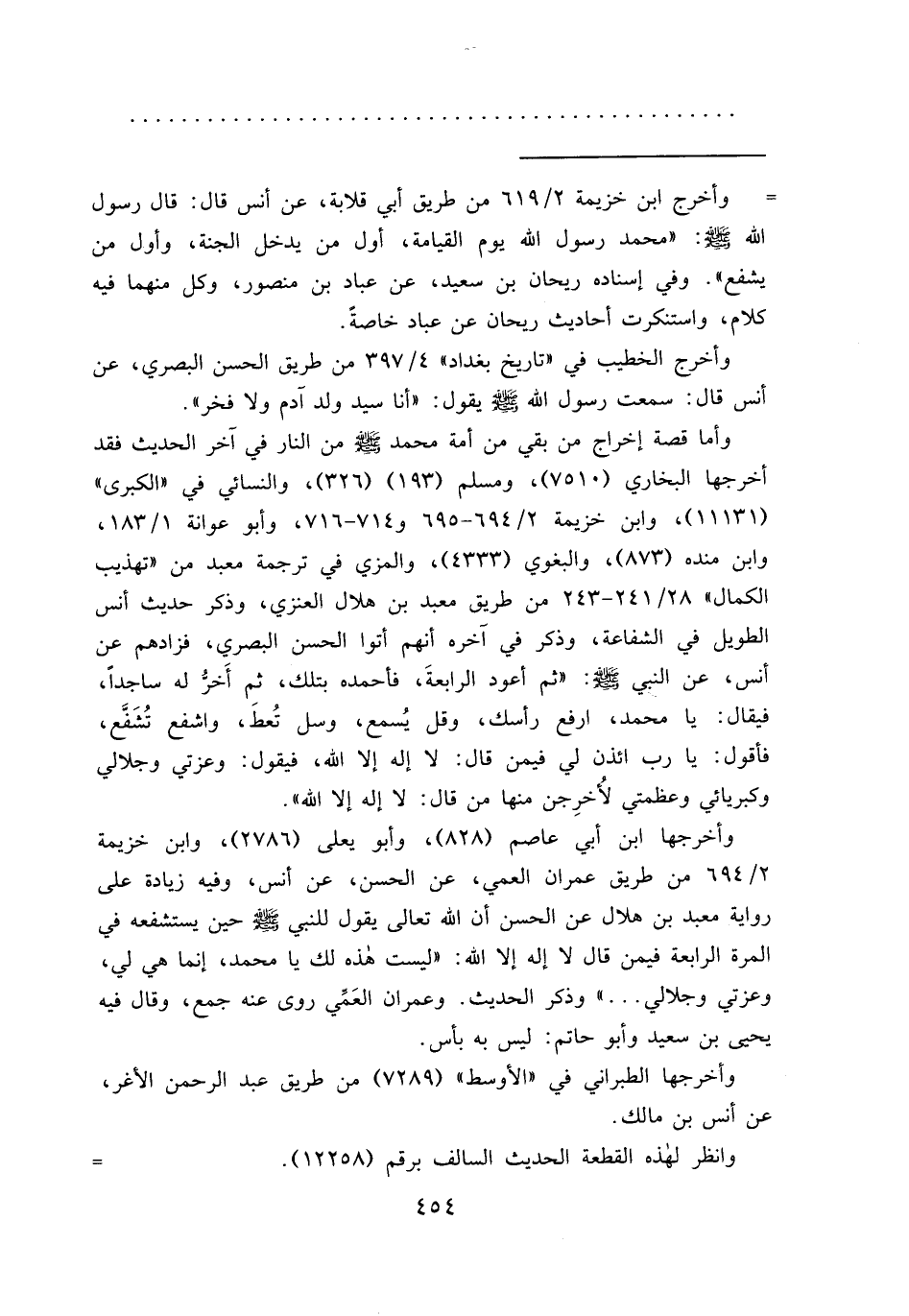 وأما قصة إخراج من بقي من أمة محمد صَلَّى اللهُ عَلَيْهِ وَسَلَّمَ من النار في آخر الحديث فقد أخرجها البخاري (٧٥١٠) ، ومسلم (١٩٣) (٣٢٦) ، والنسائي في "الكبرى" (١١١٣١) ، وابن خزيمة ٢/٦٩٤-٦٩٥ و٧١٤-٧١٦، وأبو عوانة ١/١٨٣، وابن منده (٨٧٣) ، والبغوي (٤٣٣٣) ، والمزي في ترجمة معبد من "تهذيب الكمال" ٢٨/٢٤١-٢٤٣ من طريق معبد بن هلال العنزي، وذكر حديث أنس الطويل في الشفاعة، وذكر في آخره أنهم أتوا الحسن البصري، فزادهم عن أنس، عن النبي صَلَّى اللهُ عَلَيْهِ وَسَلَّمَ: "ثم أعود الرابعة، فأحمده بتلك، ثم أخرُ له ساجداً، فيقال: يا محمد، ارفع رأسك، وقل يُسمع، وسل تُعط، واشفع تُشفَّع، فأقول: يا رب ائذن لي فيمن قال: لا إله إلا الله، فيقول: وعزتي وجلالي وكبريائي وعظمتي لأخرجن منها من قال: لا إله إلا الله".