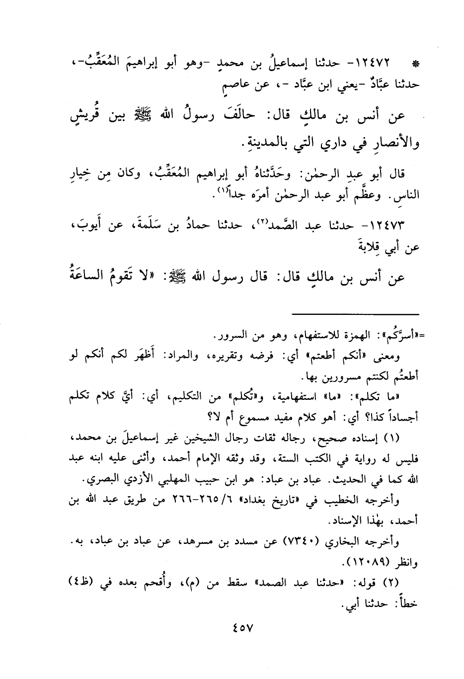 * ١٢٤٧٢ - حَدَّثَنَا إِسْمَاعِيلُ بْنُ مُحَمَّدٍ وَهُوَ أَبُو إِبْرَاهِيمَ الْمُعَقِّبُ، حَدَّثَنَا عَبَّادٌ يَعْنِي ابْنَ عَبَّادٍ، عَنْ عَاصِمٍ، عَنْ أَنَسِ بْنِ مَالِكٍ قَالَ: " حَالَفَ رَسُولُ اللهِ صَلَّى اللهُ عَلَيْهِ وَسَلَّمَ بَيْنَ قُرَيْشٍ وَالْأَنْصَارِ فِي دَارِي الَّتِي بِالْمَدِينَةِ " قَالَ أَبُو عَبْدِ الرَّحْمَنِ: وَحَدَّثَنَاهُ أَبُو إِبْرَاهِيمَ الْمُعَقِّبُ، " وَكَانَ مِنْ خِيَارِ النَّاسِ، وَعَظَّمَ أَبُو عَبْدِ الرَّحْمَنِ أَمْرَهُ جِدًّا " (١)