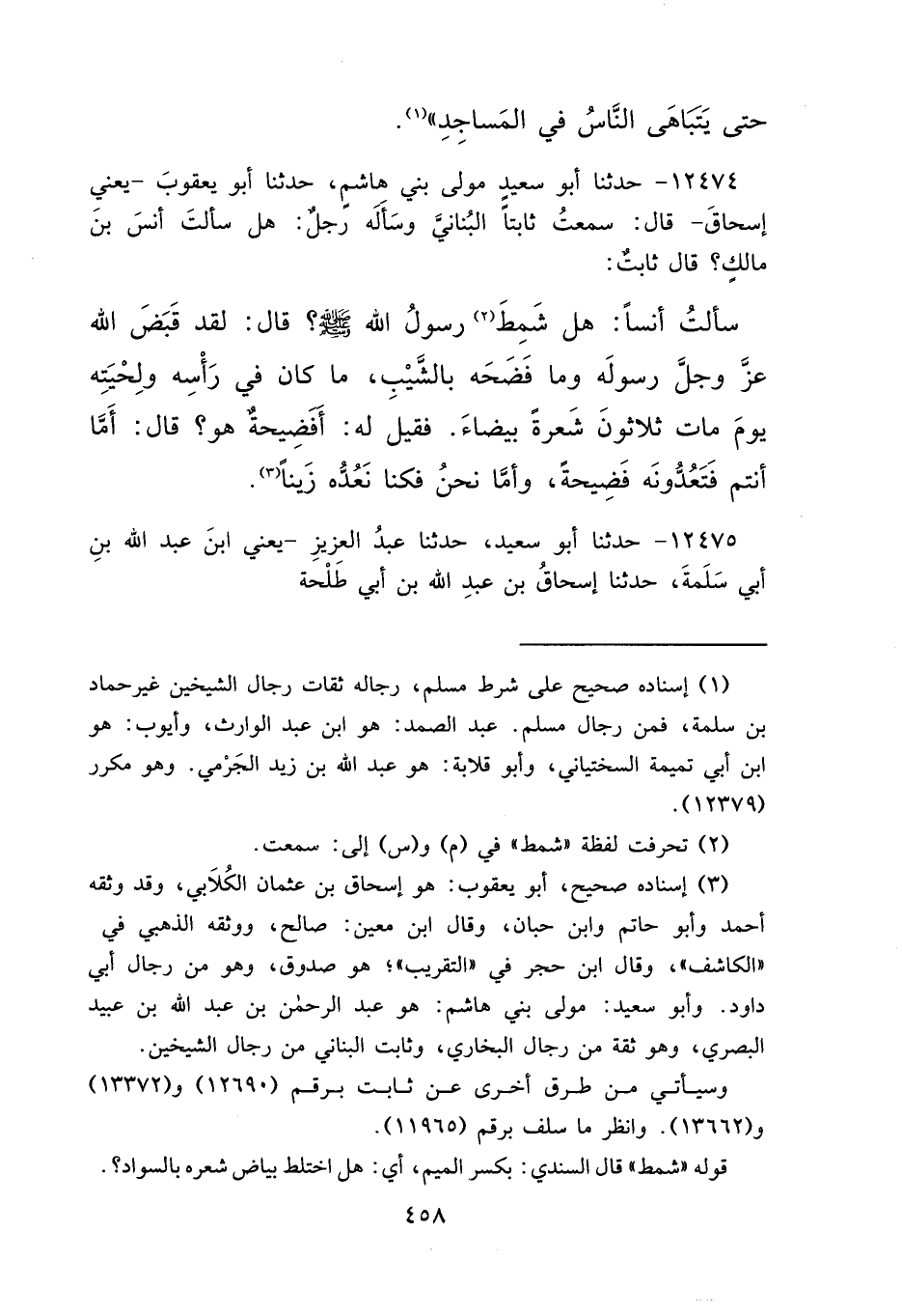 ١٢٤٧٤ - حَدَّثَنَا أَبُو سَعِيدٍ، مَوْلَى بَنِي هَاشِمٍ، حَدَّثَنَا أَبُو يَعْقُوبَ يَعْنِي إِسْحَاقَ، قَالَ: سَمِعْتُ ثَابِتًا الْبُنَانِيَّ، وَسَأَلَهُ رَجُلٌ: هَلْ سَأَلْتَ أَنَسَ بْنَ مَالِكٍ؟ قَالَ ثَابِتٌ: سَأَلْتُ أَنَسًا، هَلْ شُمِطَ (٢) رَسُولَ اللهِ صَلَّى اللهُ عَلَيْهِ وَسَلَّمَ قَالَ: " لَقَدْ قَبَضَ اللهُ عَزَّ وَجَلَّ رَسُولَهُ، وَمَا فَضَحَهُ بِالشَّيْبِ، مَا كَانَ فِي رَأْسِهِ وَلِحْيَتِهِ يَوْمَ مَاتَ ثَلَاثُونَ شَعَرَةً بَيْضَاءَ " فَقِيلَ لَهُ أَفَضِيحَةٌ هُوَ؟ قَالَ: " أَمَّا أَنْتُمْ فَتَعُدُّونَهُ فَضِيحَةً، وَأَمَّا نَحْنُ فَكُنَّا نَعُدُّهُ زَيْنًا " (٣)