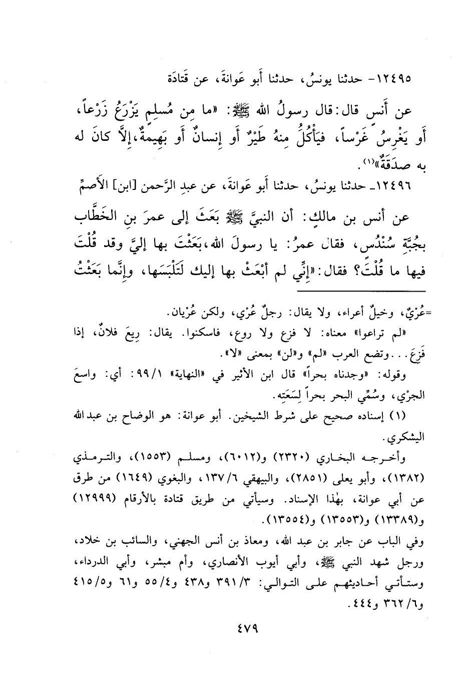 ١٢٤٩٥ - حَدَّثَنَا يُونُسُ، حَدَّثَنَا أَبُو عَوَانَةَ، عَنْ قَتَادَةَ، عَنْ أَنَسٍ قَالَ: قَالَ رَسُولُ اللهِ صَلَّى اللهُ عَلَيْهِ وَسَلَّمَ: " مَا مِنْ مُسْلِمٍ يَزْرَعُ زَرْعًا، أَوْ يَغْرِسُ غَرْسًا، فَيَأْكُلُ مِنْهُ طَيْرٌ، أَوْ إِنْسَانٌ، أَوْ بَهِيمَةٌ إِلَّا كَانَ لَهُ بِهِ صَدَقَةٌ " (١)