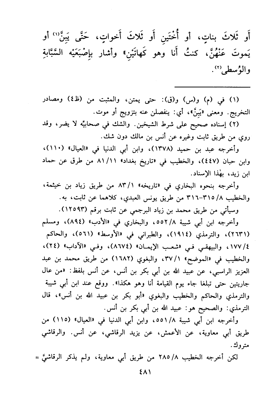 جاريتين حتى تبلغا جاء يوم القيامة أنا وهو هكذا". ووقع عند ابن أبي شيبة والترمذي والحاكم والخطيب والبغوي "أبو بكر بن عبيد الله بن أنس"، قال الترمذي: والصحيح هو: عبيد الله بن أبي بكر بن أنس.