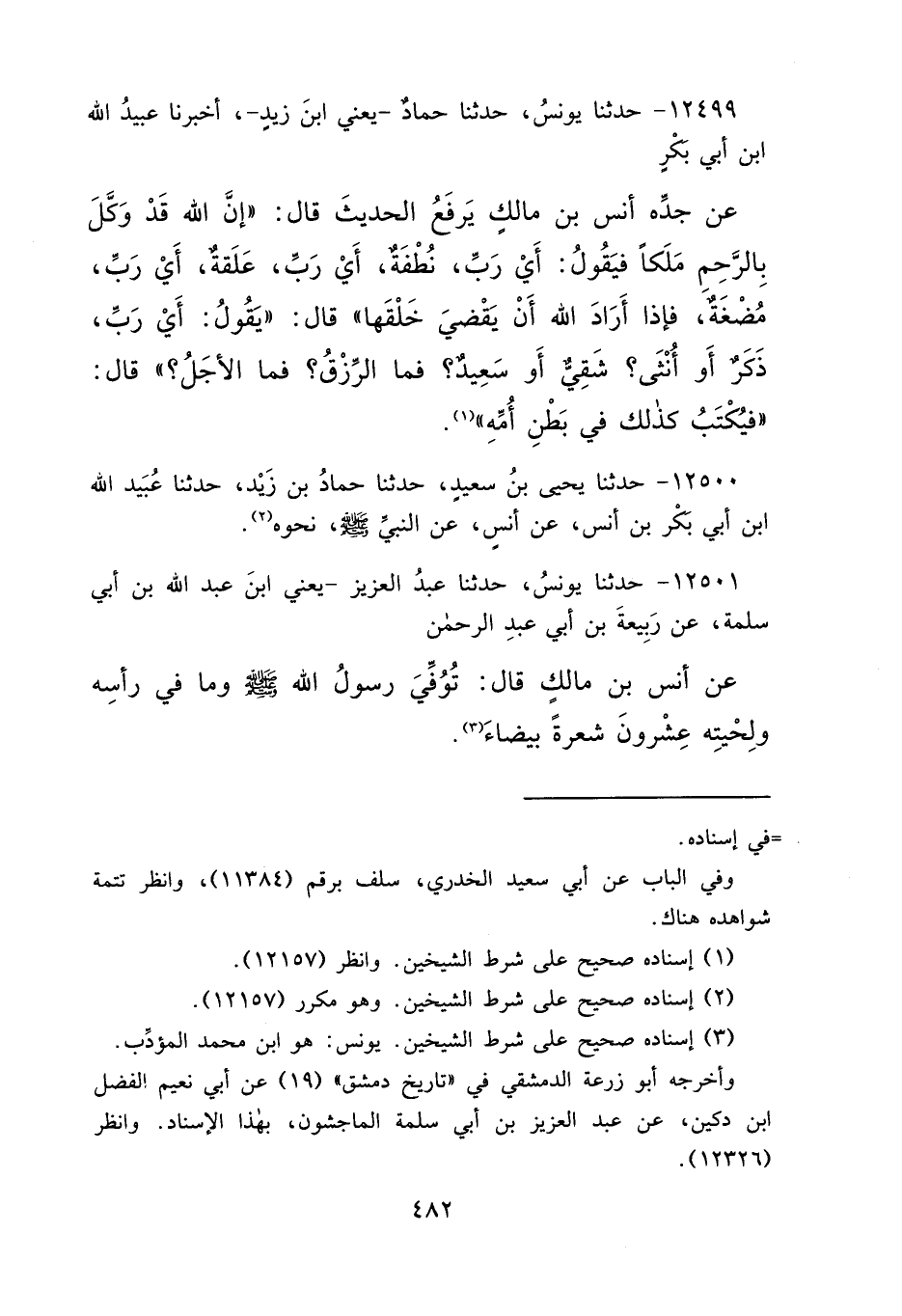 ١٢٤٩٩ - حَدَّثَنَا يُونُسُ، حَدَّثَنَا حَمَّادٌ يَعْنِي ابْنَ زَيْدٍ، أَخْبَرَنَا عُبَيْدُ اللهِ بْنُ أَبِي بَكْرٍ، عَنْ جَدِّهِ أَنَسِ بْنِ مَالِكٍ يَرْفَعُ الْحَدِيثَ، قَالَ: " إِنَّ اللهَ قَدْ وَكَّلَ بِالرَّحِمِ مَلَكًا، فَيَقُولُ: أَيْ رَبِّ، نُطْفَةٌ، أَيْ رَبِّ، عَلَقَةٌ، أَيْ رَبِّ، مُضْغَةٌ، فَإِذَا أَرَادَ اللهُ أَنْ يَقْضِيَ خَلْقَهَا "، قَالَ: " يَقُولُ أَيْ رَبِّ ذَكَرٌ أَوْ أُنْثَى؟ شَقِيٌّ أَوْ سَعِيدٌ؟ فَمَا الرِّزْقُ؟ فَمَا الْأَجَلُ؟ قَالَ: فَيُكْتَبُ كَذَلِكَ فِي بَطْنِ أُمِّهِ " (١)