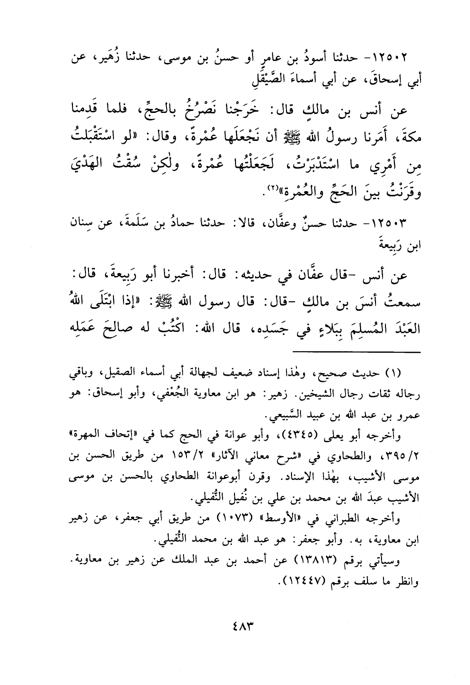 ١٢٥٠٢ - حَدَّثَنَا، أَسْوَدُ بْنُ عَامِرٍ أَوْ حَسَنُ بْنُ مُوسَى، حَدَّثَنَا زُهَيْرٌ، عَنْ أَبِي إِسْحَاقَ، عَنْ أَبِي أَسْمَاءَ الصَّيْقَلِ، عَنْ أَنَسِ بْنِ مَالِكٍ قَالَ: خَرَجْنَا نَصْرُخُ بِالْحَجِّ، فَلَمَّا قَدِمْنَا مَكَّةَ، أَمَرَنَا رَسُولُ اللهِ صَلَّى اللهُ عَلَيْهِ وَسَلَّمَ، أَنْ نَجْعَلَهَا عُمْرَةً. وَقَالَ: " لَوِ اسْتَقْبَلْتُ مِنْ أَمْرِي مَا اسْتَدْبَرْتُ لَجَعَلْتُهَا عُمْرَةً، وَلَكِنْ سُقْتُ الْهَدْيَ وَقَرَنْتُ بَيْنَ الْحَجِّ وَالْعُمْرَةِ " (١)