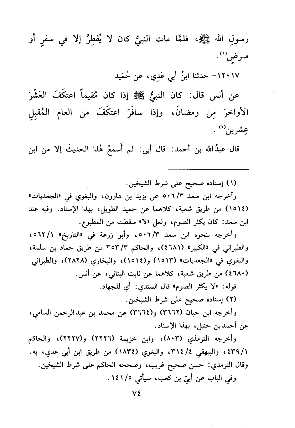 ١٢٠١٧ - حَدَّثَنَا ابْنُ أَبِي عَدِيٍّ، عَنْ حُمَيْدٍ، عَنْ أَنَسٍ قَالَ: " كَانَ النَّبِيُّ صَلَّى اللهُ عَلَيْهِ وَسَلَّمَ إِذَا كَانَ مُقِيمًا اعْتَكَفَ الْعَشْرَ الْأَوَاخِرَ مِنْ رَمَضَانَ، وَإِذَا سَافَرَ اعْتَكَفَ مِنَ الْعَامِ الْمُقْبِلِ عِشْرِينَ (٢) " قَالَ عَبْدُ اللهِ بْنُ أَحْمَدَ: قَالَ أَبِي: " لَمْ أَسْمَعْ هَذَا الْحَدِيثَ إِلَّا مِنْ ابْنِ