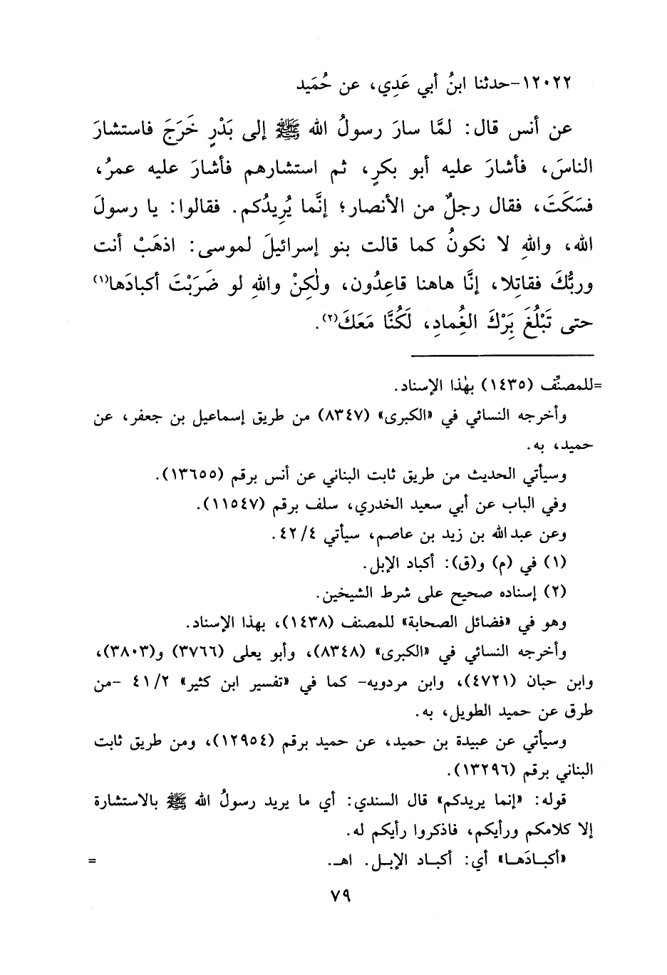 ١٢٠٢٢ - حَدَّثَنَا ابْنُ أَبِي عَدِيٍّ، عَنْ حُمَيْدٍ، عَنْ أَنَسٍ قَالَ: " لَمَّا سَارَ رَسُولُ اللهِ صَلَّى اللهُ عَلَيْهِ وَسَلَّمَ إِلَى بَدْرٍ خَرَجَ فَاسْتَشَارَ النَّاسَ، فَأَشَارَ عَلَيْهِ أَبُو بَكْرٍ، ثُمَّ اسْتَشَارَهُمْ، فَأَشَارَ عَلَيْهِ عُمَرُ، فَسَكَتَ "، فَقَالَ رَجُلٌ مِنَ الْأَنْصَارِ: إِنَّمَا يُرِيدُكُمْ فَقَالُوا: يَا رَسُولَ اللهِ، وَاللهِ لَا نَكُونُ كَمَا قَالَتْ بَنُو إِسْرَائِيلَ لِمُوسَى: {اذْهَبْ أَنْتَ وَرَبُّكَ فَقَاتِلَا إِنَّا هَاهُنَا قَاعِدُونَ} ، وَلَكِنْ وَاللهِ لَوْ ضَرَبْتَ أَكْبَادَهَا (١) حَتَّى تَبْلُغَ بَرْكَ الْغِمَادِ لَكُنَّا مَعَكَ (٢)