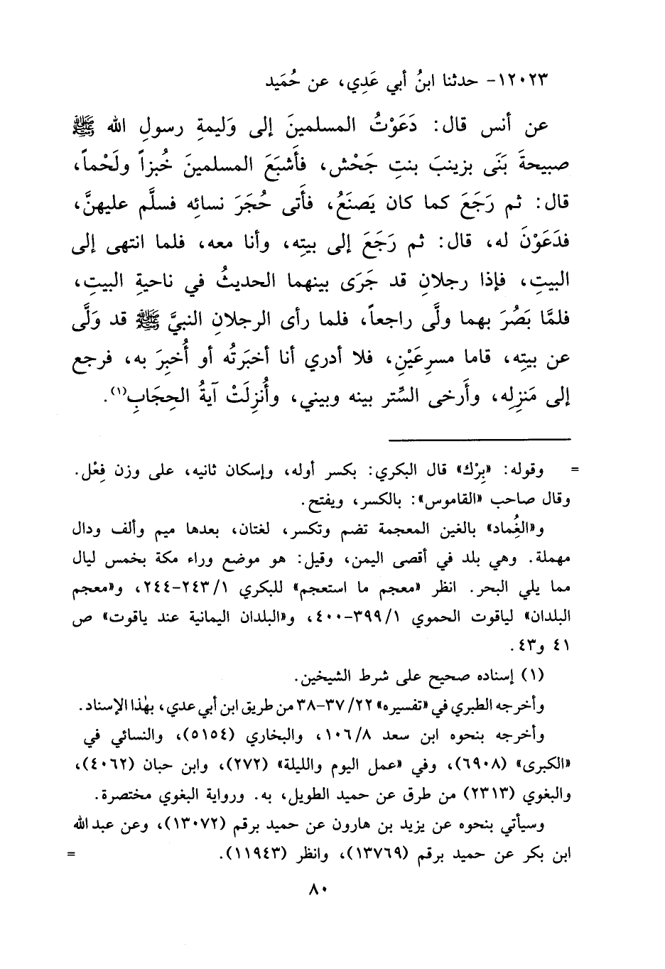 ١٢٠٢٣ - حَدَّثَنَا ابْنُ أَبِي عَدِيٍّ، عَنْ حُمَيْدٍ، عَنْ أَنَسٍ قَالَ: دَعَوْتُ الْمُسْلِمِينَ إِلَى وَلِيمَةِ رَسُولِ اللهِ صَلَّى اللهُ عَلَيْهِ وَسَلَّمَ صَبِيحَةَ بَنَى بِزَيْنَبَ بِنْتِ جَحْشٍ، فَأَشْبَعَ الْمُسْلِمِينَ خُبْزًا وَلَحْمًا قَالَ: " ثُمَّ رَجَعَ كَمَا كَانَ يَصْنَعُ فَأَتَى حُجَرَ نِسَائِهِ فَسَلَّمَ عَلَيْهِنَّ فَدَعَوْنَ لَهُ ". قَالَ: " ثُمَّ رَجَعَ إِلَى بَيْتِهِ وَأَنَا مَعَهُ، فَلَمَّا انْتَهَى إِلَى الْبَيْتِ، فَإِذَا رَجُلَانِ قَدْ جَرَى بَيْنَهُمَا الْحَدِيثُ فِي نَاحِيَةِ الْبَيْتِ، فَلَمَّا بَصَرَ بِهِمَا وَلَّى رَاجِعًا، فَلَمَّا رَأَى الرَّجُلَانِ النَّبِيَّ صَلَّى اللهُ عَلَيْهِ وَسَلَّمَ قَدْ وَلَّى عَنْ بَيْتِهِ قَامَا مُسْرِعَيْنِ، فَلَا أَدْرِي أَنَا أَخْبَرْتُهُ أَوْ أُخْبِرَ بِهِ فَرَجَعَ إِلَى مَنْزِلِهِ وَأَرْخَى السِّتْرَ بَيْنَهُ وَبَيْنِي، وَأُنْزِلَتْ آيَةُ الْحِجَابِ " (١)