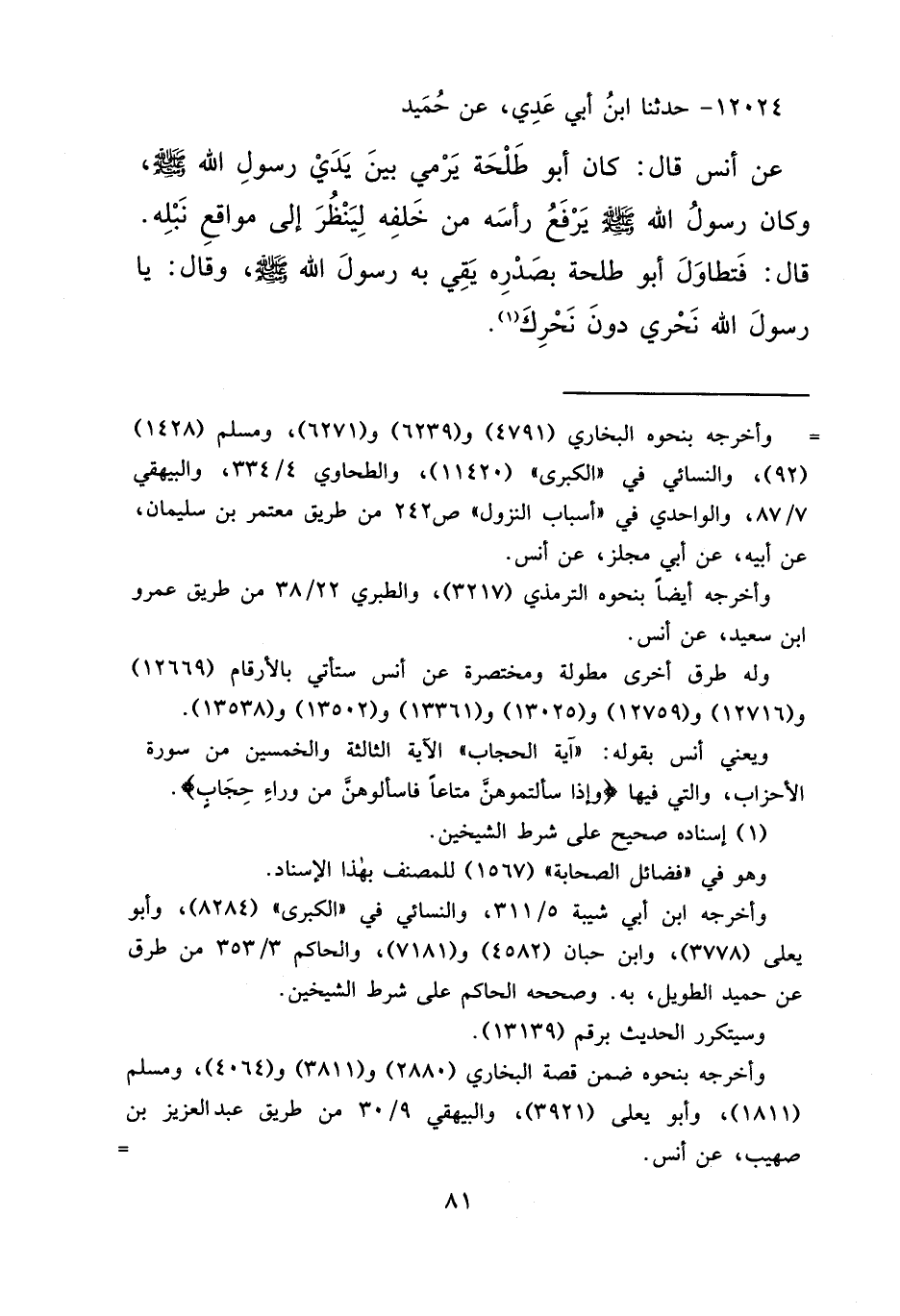 ١٢٠٢٤ - حَدَّثَنَا ابْنُ أَبِي عَدِيٍّ، عَنْ حُمَيْدٍ، عَنْ أَنَسٍ قَالَ: " كَانَ أَبُو طَلْحَةَ يَرْمِي بَيْنَ يَدَيْ رَسُولِ اللهِ صَلَّى اللهُ عَلَيْهِ وَسَلَّمَ، وَكَانَ رَسُولُ اللهِ صَلَّى اللهُ عَلَيْهِ وَسَلَّمَ يَرْفَعُ رَأْسَهُ مِنْ خَلْفِهِ لِيَنْظُرَ إِلَى مَوَاقِعِ نَبْلِهِ قَالَ: فَتَطَاوَلَ أَبُو طَلْحَةَ بِصَدْرِهِ يَقِي بِهِ رَسُولَ اللهِ صَلَّى اللهُ عَلَيْهِ وَسَلَّمَ، وَقَالَ: يَا رَسُولَ اللهِ، نَحْرِي دُونَ نَحْرِكَ " (١)