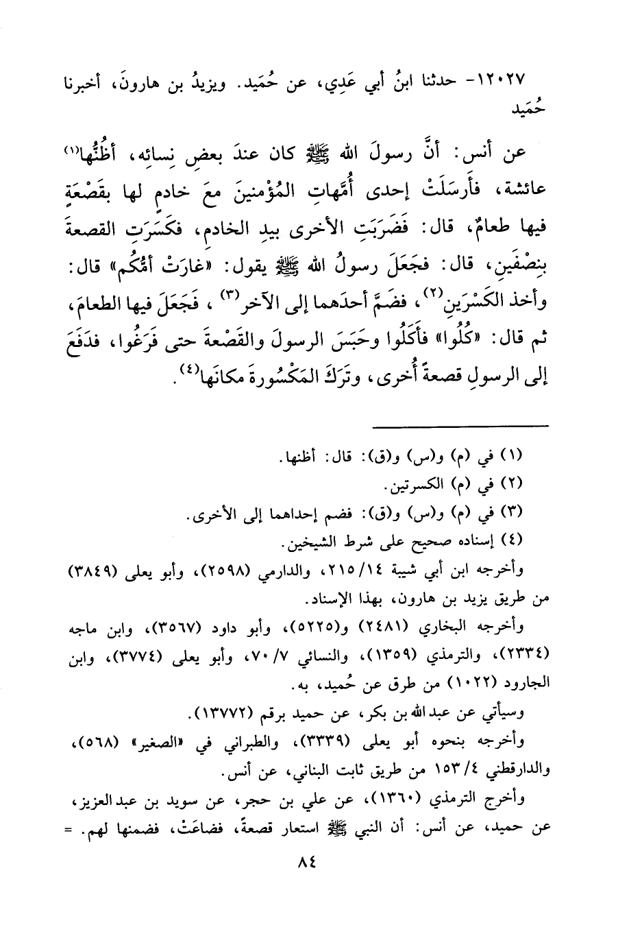 ١٢٠٢٧ - حَدَّثَنَا ابْنُ أَبِي عَدِيٍّ، عَنْ حُمَيْدٍ، وَيَزِيدُ بْنُ هَارُونَ، أَخْبَرَنَا حُمَيْدٌ، عَنْ أَنَسٍ، أَنَّ رَسُولَ اللهِ صَلَّى اللهُ عَلَيْهِ وَسَلَّمَ كَانَ عِنْدَ بَعْضِ نِسَائِهِ - أَظُنُّهَا (١) عَائِشَةَ - فَأَرْسَلَتْ إِحْدَى أُمَّهَاتِ الْمُؤْمِنِينَ مَعَ خَادِمٍ لَهَا بِقَصْعَةٍ فِيهَا طَعَامٌ، قَالَ: فَضَرَبَتِ الْأُخْرَى بِيَدِ الْخَادِمِ، فَكُسِرَتِ الْقَصْعَةُ بِنِصْفَيْنِ، قَالَ: فَجَعَلَ رَسُولُ اللهِ صَلَّى اللهُ عَلَيْهِ وَسَلَّمَ يَقُولُ: " غَارَتْ أُمُّكُمْ "، قَالَ: وَأَخَذَ الْكَسْرَيْنِ (٢) فَضَمَّ إِحْدَاهُمَا إِلَى الآخْر (٣) ، فَجَعَلَ فِيهَا الطَّعَامَ، ثُمَّ قَالَ: " كُلُوا " فَأَكَلُوا وَحَبَسَ الرَّسُولَ، وَالْقَصْعَةَ حَتَّى فَرَغُوا، فَدَفَعَ إِلَى الرَّسُولِ قَصْعَةً أُخْرَى، وَتَرَكَ الْمَكْسُورَةَ مَكَانَهَا (٤)