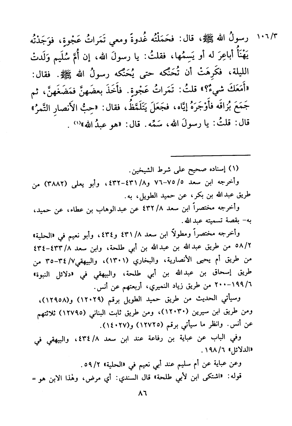 رَسُولُ اللهِ صَلَّى اللهُ عَلَيْهِ وَسَلَّمَ، قَالَ: فَحَمَلْتُهُ غُدْوَةً، وَمَعِي تَمَرَاتُ عَجْوَةٍ، فَوَجَدْتُهُ يَهْنَأُ أَبَاعِرَ لَهُ، أَوْ يَسِمُهَا، فَقُلْتُ: يَا رَسُولَ اللهِ، إِنَّ أُمَّ سُلَيْمٍ وَلَدَتِ اللَّيْلَةَ، فَكَرِهَتْ أَنْ تُحَنِّكَهُ حَتَّى يُحَنِّكَهُ رَسُولُ اللهِ صَلَّى اللهُ عَلَيْهِ وَسَلَّمَ، فَقَالَ: " أَمَعَكَ شَيْءٌ؟ " قُلْتُ: تَمَرَاتُ عَجْوَةٍ، فَأَخَذَ بَعْضَهُنَّ فَمَضَغَهُنَّ، ثُمَّ جَمَعَ بُزَاقَهُ فَأَوْجَرَهُ إِيَّاهُ، فَجَعَلَ يَتَلَمَّظُ، فَقَالَ: " حُبُّ الْأَنْصَارِ التَّمْرَ ". قَالَ: قُلْتُ: يَا رَسُولَ اللهِ سَمِّهِ، قَالَ: " هُوَ عَبْدُ اللهِ "، (١)