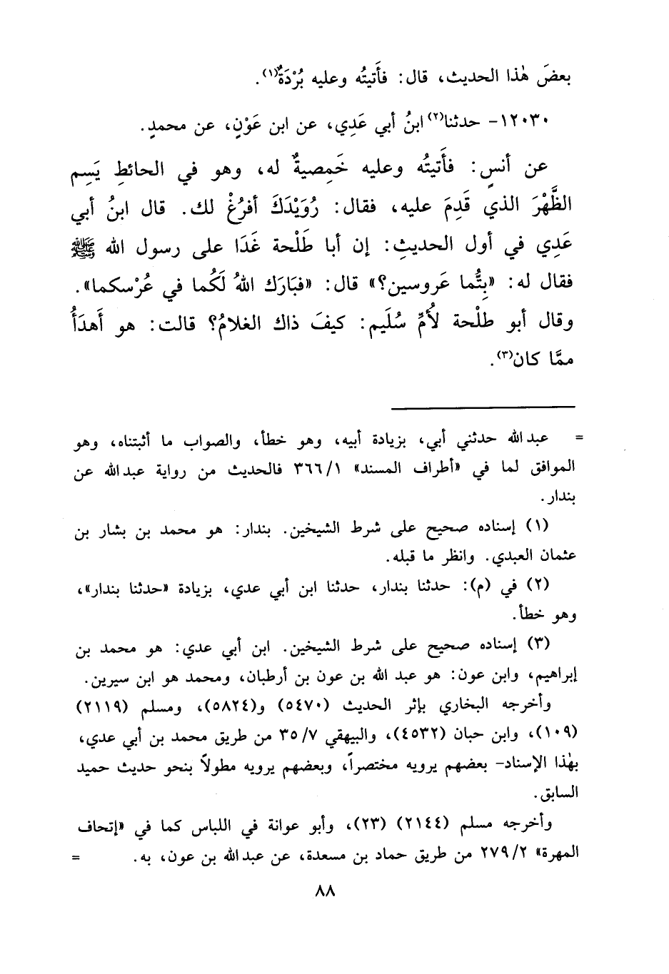 ١٢٠٣٠ - حَدَّثَنَا (٢) ابْنُ أَبِي عَدِيٍّ، عَنْ ابْنِ عَوْنٍ، عَنْ مُحَمَّدٍ، عَنْ أَنَسٍ فَأَتَيْتُهُ وَعَلَيْهِ خَمِيصَةٌ لَهُ وَهُوَ فِي الْحَائِطِ يَسِمُ الظَّهْرَ الَّذِي قَدِمَ عَلَيْهِ فَقَالَ: رُوَيْدَكَ أَفْرُغُ لَكَ قَالَ ابْنُ أَبِي عَدِىٍّ: - فِي أَوَّلِ الْحَدِيثِ - إِنَّ أَبَا طَلْحَةَ غَدَا عَلَى رَسُولِ اللهِ صَلَّى اللهُ عَلَيْهِ وَسَلَّمَ فَقَالَ لَهُ: " بِتُّمَا عَرُوسَيْنِ ". قَالَ: " فَبَارَكَ اللهُ لَكُمَا فِي عُرْسِكُمَا "، وَقَالَ أَبُو طَلْحَةَ لِأُمِّ سُلَيْمٍ: كَيْفَ ذَاكَ الْغُلَامُ؟ قَالَتْ: هُوَ أَهْدَأُ مِمَّا كَانَ (٣)